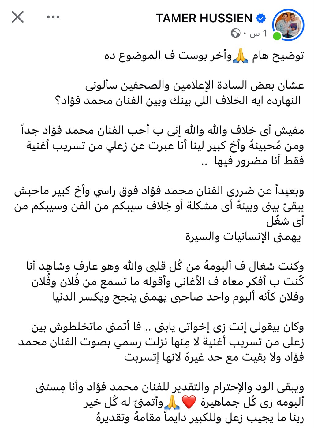 وكتب تامر حسين عبر صفحته الشخصية على موقع التواصل الإجتماعي فيس بوك : توضيح هام وأخر بوست في الموضوع ده عشان بعض السادة الإعلامين والصحفيين سألونى النهارده ايه الخلاف اللى بينك وبين الفنان محمد فؤاد؟