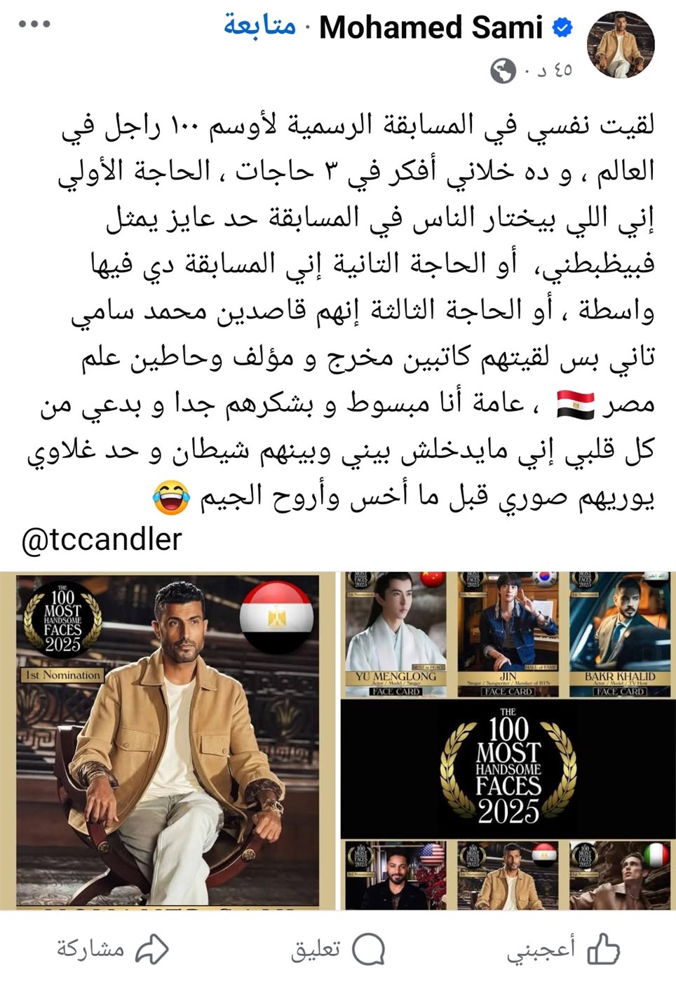 وكتب محمد سامي في منشور له عبر حسابه على فيسبوك: “ لقيت نفسي في المسابقة الرسمية لأوسم 100 راجل في العالم”.