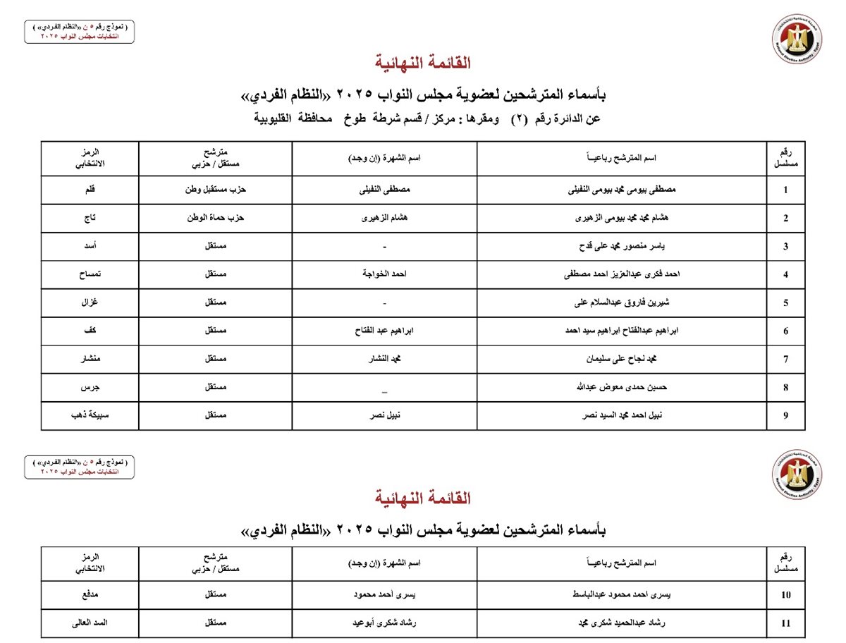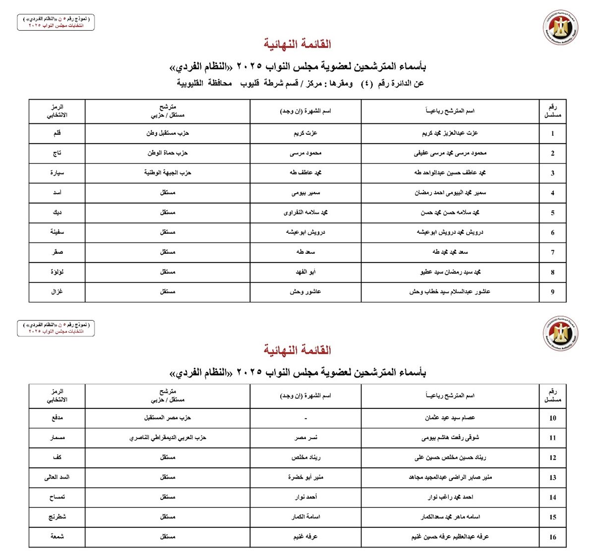 الهيئة الوطنية للانتخابات تكشف قائمة مرشحي النظام الفردي بمحافظة القليوبية