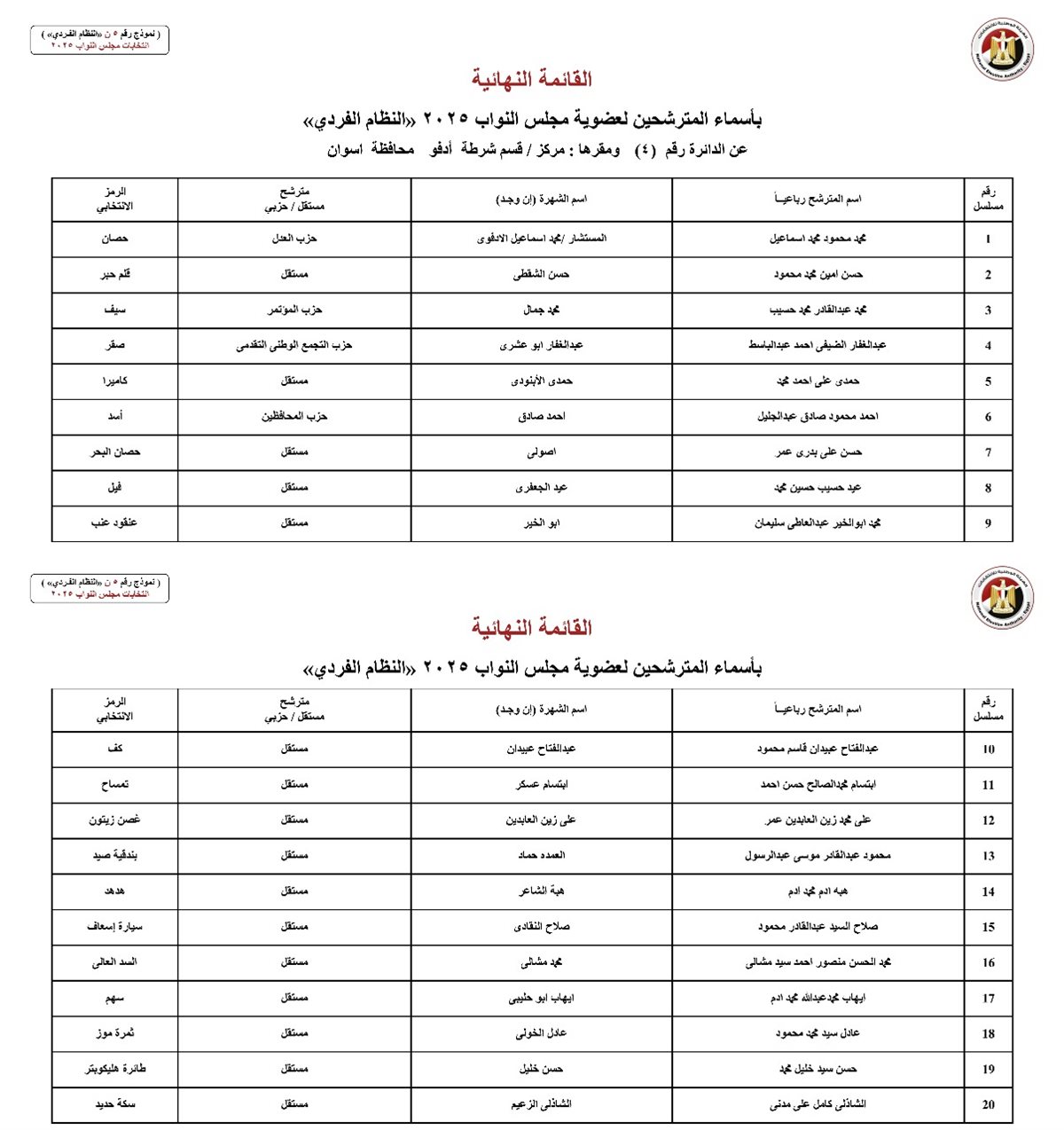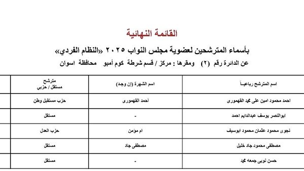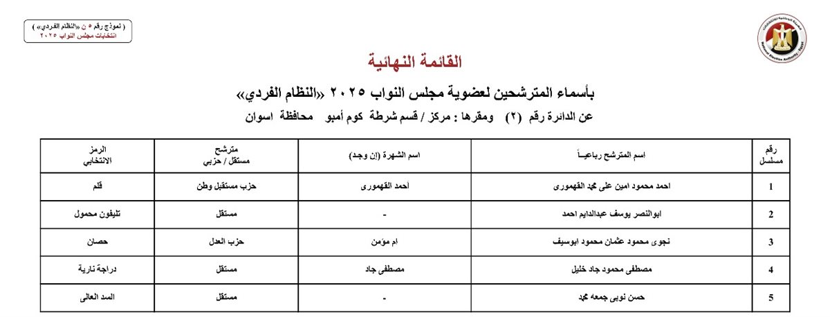 الهيئة الوطنية تكشف أسماء مرشحي النظام الفردي بانتخابات البرلمان 2025 بأسوان