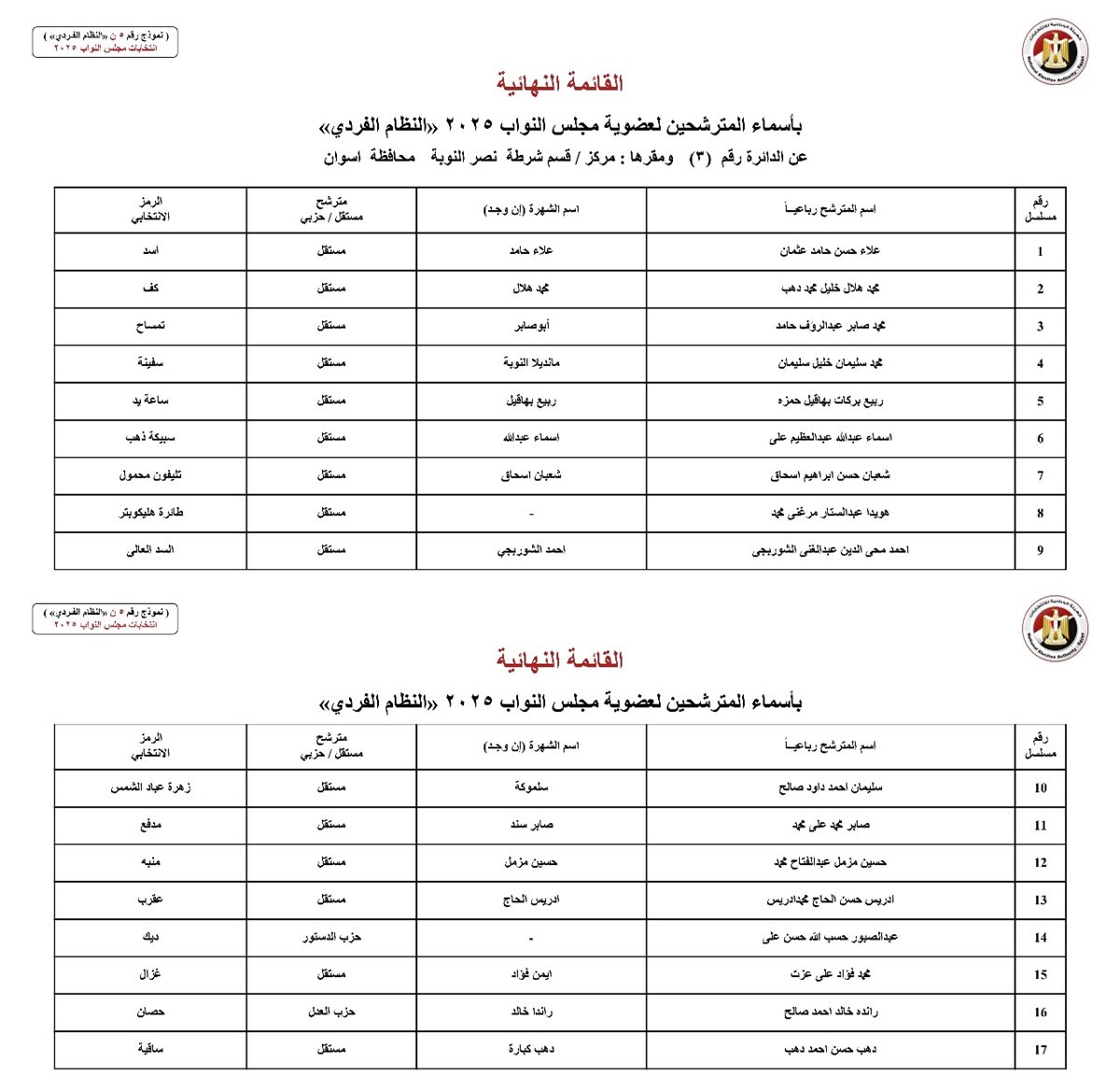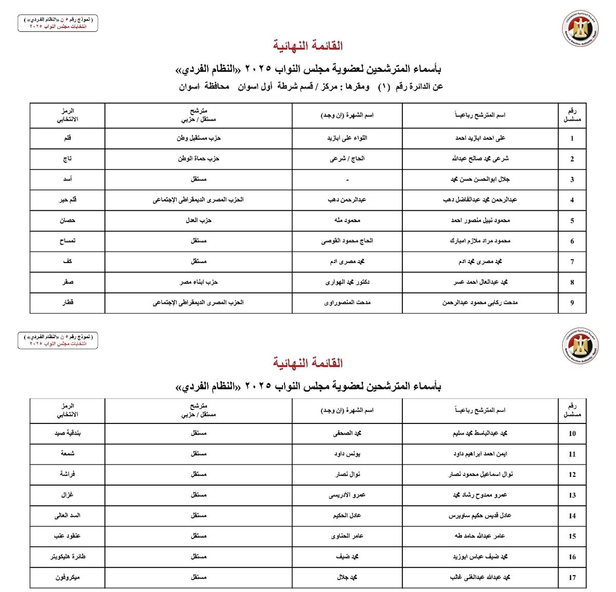 أعلنت الهيئة الوطنية للانتخابات برئاسة القاضى حازم بدوى، منذ قليل أسماء المرشحين على النظام الفردى لانتخابات مجلس النواب 2025 بمحافظة أسوان.