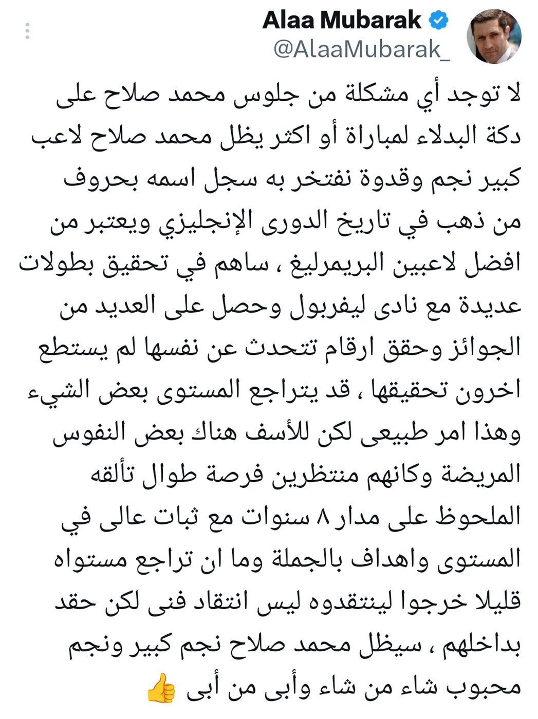 وكتب علاء مبارك في تغريدة له عبر حسابه على منصة إكس قائلا: لا توجد أي مشكلة من جلوس محمد صلاح على دكة البدلاء لمباراة أو أكثر يظل محمد صلاح لاعب كبير نجم وقدوة نفتخر به.
