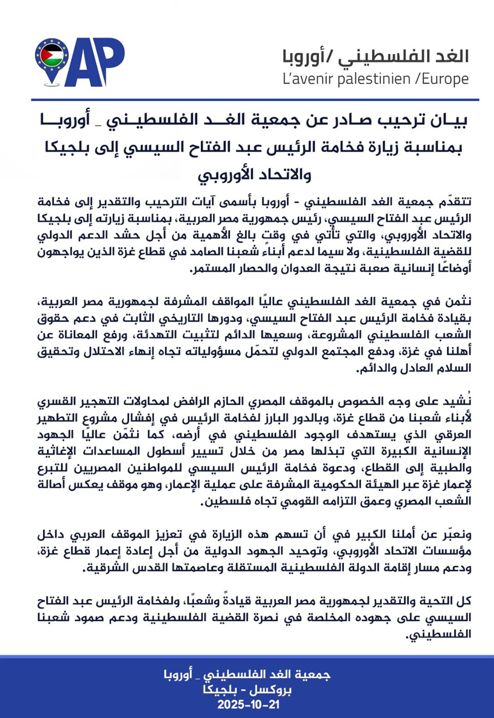 بيان ترحيب من جمعية الغد الفلسطيني بمناسبة زيارة الرئيس السيسي لبلجيكا