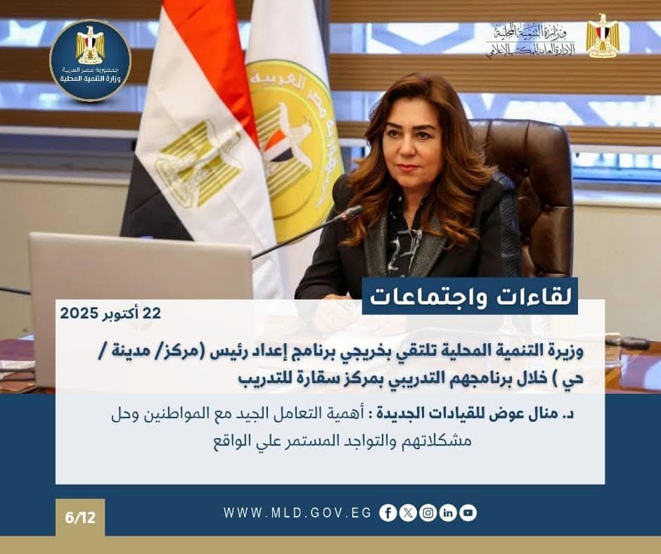 التقت الدكتورة منال عوض عبر الفيديو كونفرانس مع خريجي برنامج إعداد رؤساء المراكز والمدن والأحياء، عقب انتهاء برنامجهم التدريبي بمعهد إعداد القادة، تمهيدًا لإعلان النتائج وتوزيع القيادات الجديدة على المحافظات.