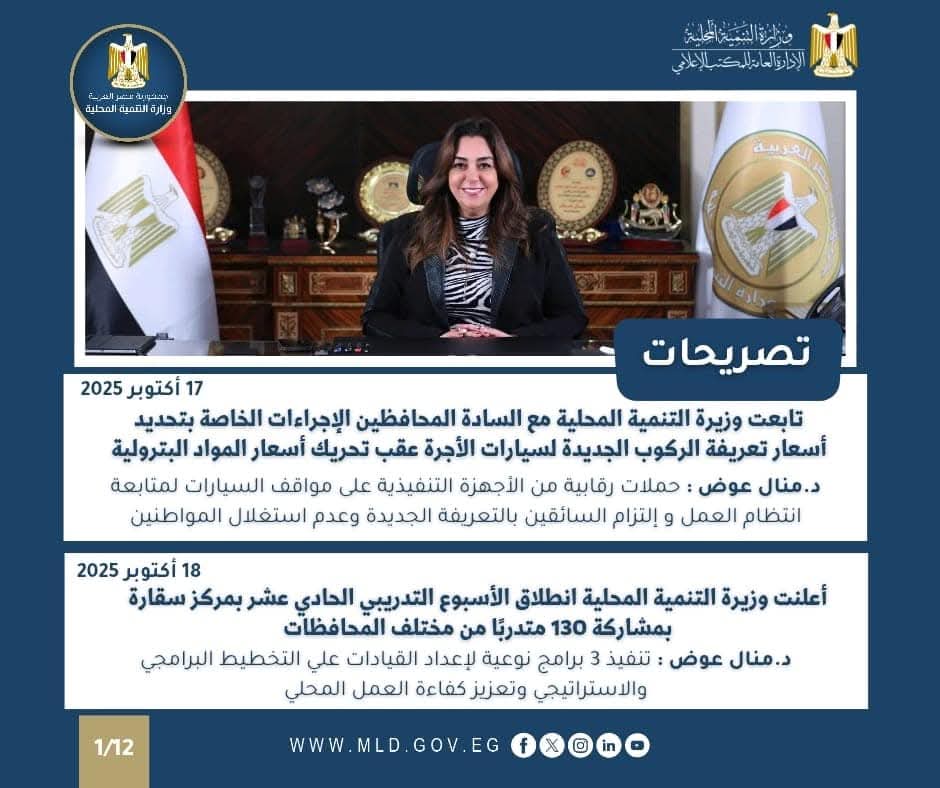 تابعت الدكتورة منال عوض مع السادة المحافظين الإجراءات الخاصة بتحديد تعريفة الركوب الجديدة للمواصلات العامة الداخلية والخارجية، وذلك عقب قرار لجنة التسعير التلقائي للمنتجات البترولية بزيادة أسعار البنزين والسولار.