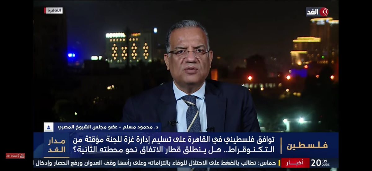 وأضاف «مسلم» في لقاء على قناة الغد: «كل ما شهدناه خلال السنوات الماضية كان جزءًا كبيرًا من أسبابه تتمثل في الانقسام الفلسطيني الفلسطيني، و بالتالي دعوة مصر لهذا الحوار هو أساس لنجاح الاتفاق، وإذا حدث خلاف بينهم سينهار اتفاق شرم الشيخ، وأنا أعني ما أقول، وكفى انقسامات بين الفصائل، وقلت لكم من فترة أن حماس ليس لديها أي خيار سوى الالتحاف بمنظمة التحرير الفلسطينية والفصائل الفلسطينية الأخرى لإنقاذ ما تبقى من غزة، و أي خلاف بين الفصائل سينتهزه الاحتلال الإسرائيلي لإفشال الاتفاق وخطة ترامب، وإذا كان هناك تعاطف مع القضية الفلسطينية دوليا، فأي خلاف وانقسام في الداخل الفلسطيني سيؤدي إلى فقد هذا التعاطف».