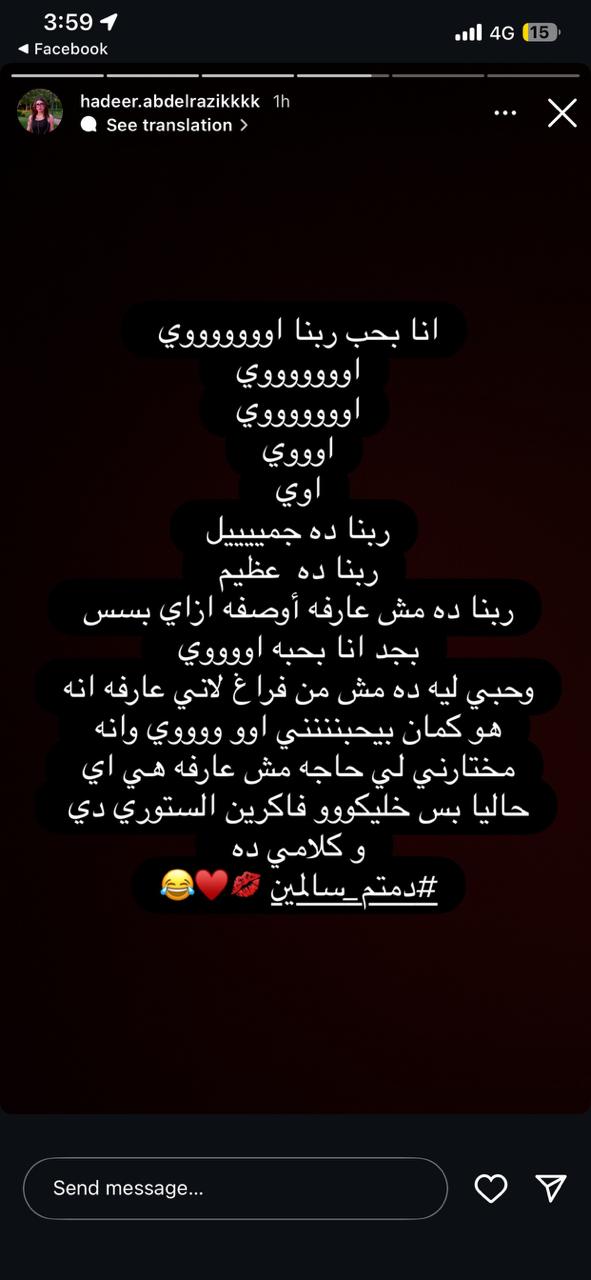 وكتب هدير عبد الرزق في استوري لها عبر حسابها الرسمي على موقع اسنتجرام قائلة: أنا بحب ربنا جدا جدا.. ربنا جميل وعظيم، ربنا أنا مش عارفة أوصفه، ازاي، بس بجد أنا بحبه جدا.