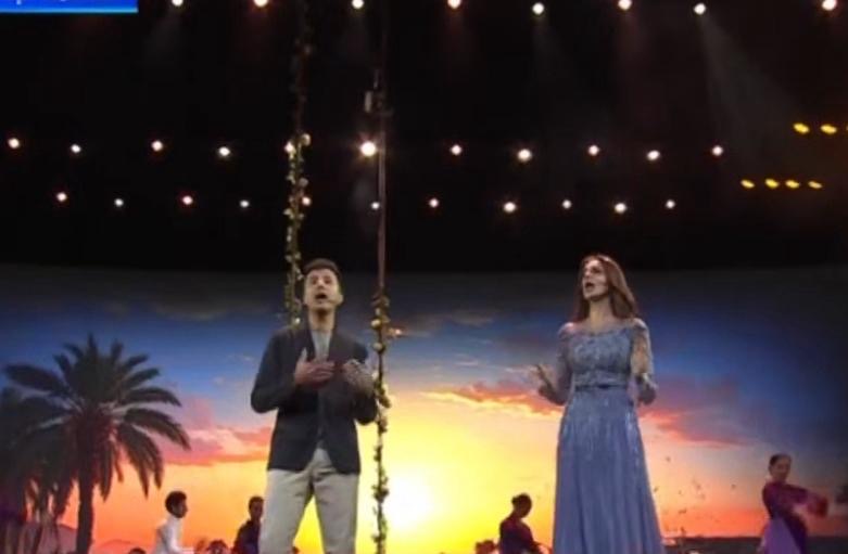 بينما ارتدى أحمد سعد بدلة بيضاء اللون منسقة مع الشال الفلسطيني.