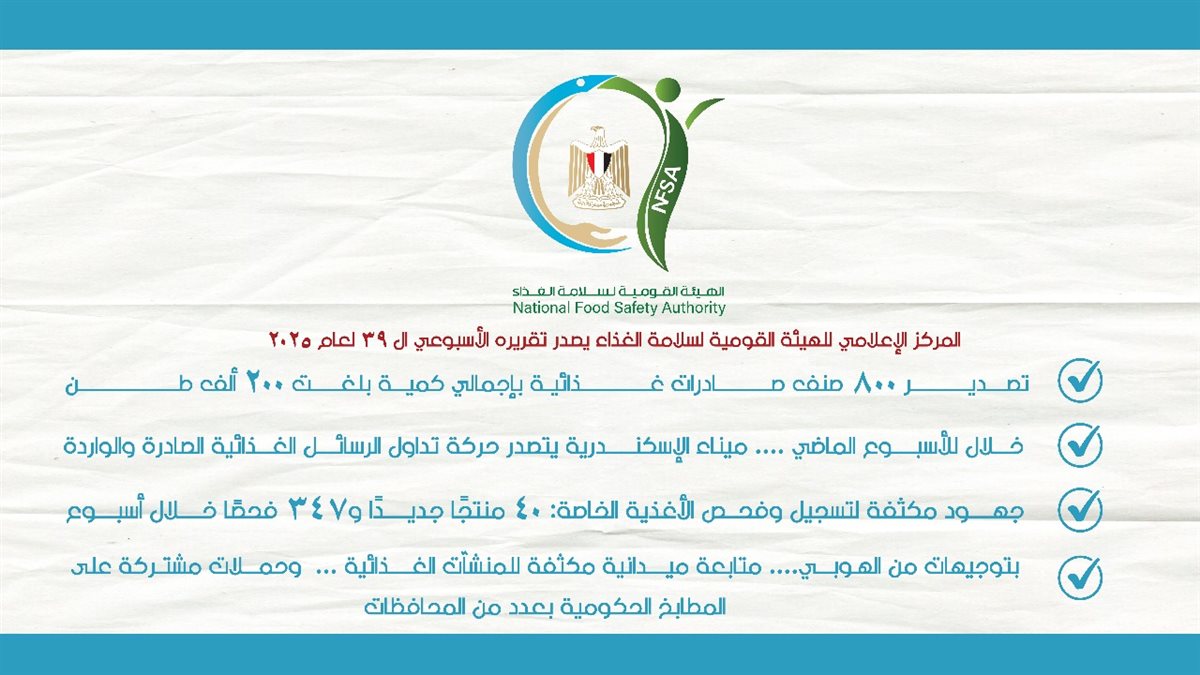 أصدر المركز الإعلامي للهيئة القومية لسلامة الغذاء تقريره الأسبوعي الـ 39 لعام 2025، وذلك عن الفترة من 18 - 24 أكتوبر، والذي تضمن العديد من الأنشطة المختلفة على النحو التالي: