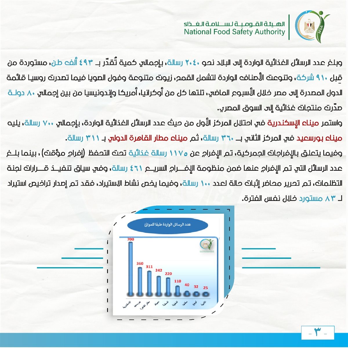 واستمر ميناء الإسكندرية في احتلال المركز الأول من حيث عدد الرسائل الغذائية الواردة، بإجمالي 700 رسالة، يليه ميناء بورسعيد في المركز الثاني بـــ 360 رسالة، ثم ميناء مطار القاهرة الدولي بـ 311 رسالة.