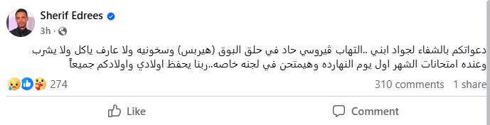أعلن الفنان شريف إدريس عن تعرض نجله إلي وعكة صحية، حيث نشر منشورًا عبر حسابه الرسمي على موقع التواصل الإجتماعي فيسبوك، وقال شريف إدريس في منشوره: “دعواتكم بالشفاء لجواد ابني، التهاب ڤيروسي حاد في حلق البوق (هيربس) وسخونية ولا عارف ياكل ولا يشرب، وعنده امتحانات الشهر أول يوم النهاردة، وهيمتحن في لجنة خاصة، ربنا يحفظ اولادي واولادكم جميعاً”.