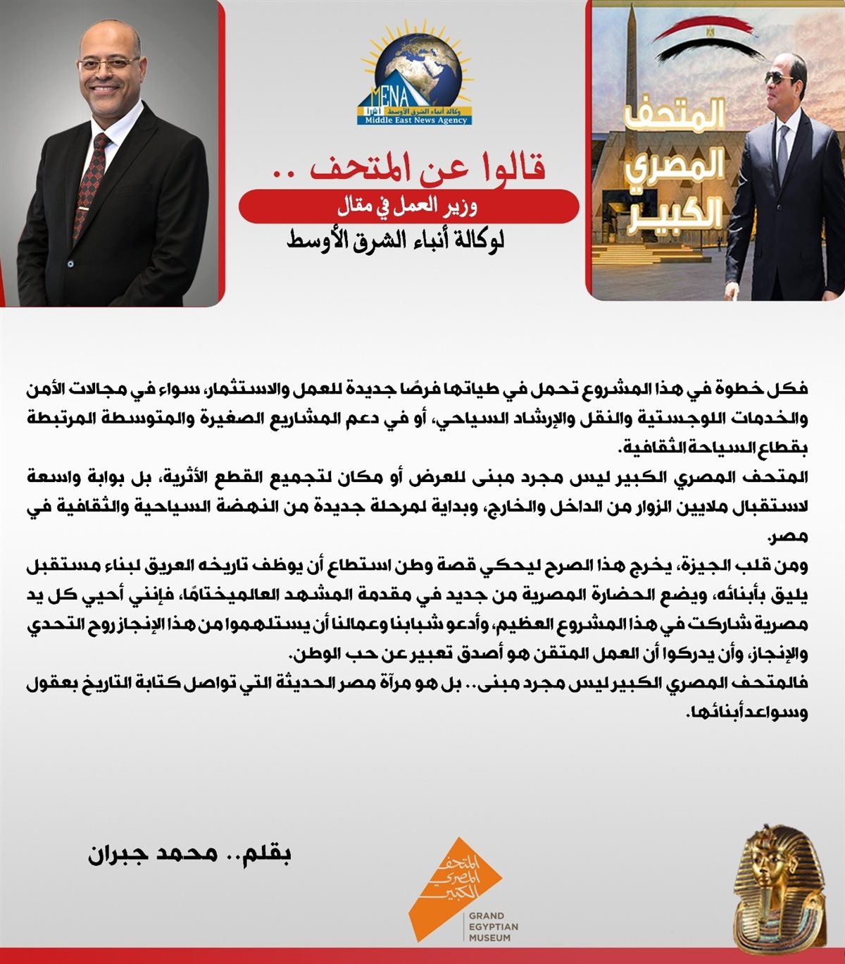كتب وزير العمل مقالا لوكالة أنباء الشرق الأوسط بعنوان .. المتحف المصري الكبير.. رمز للتنمية المستدامة ورسالة سلام من أرض الحضارة.