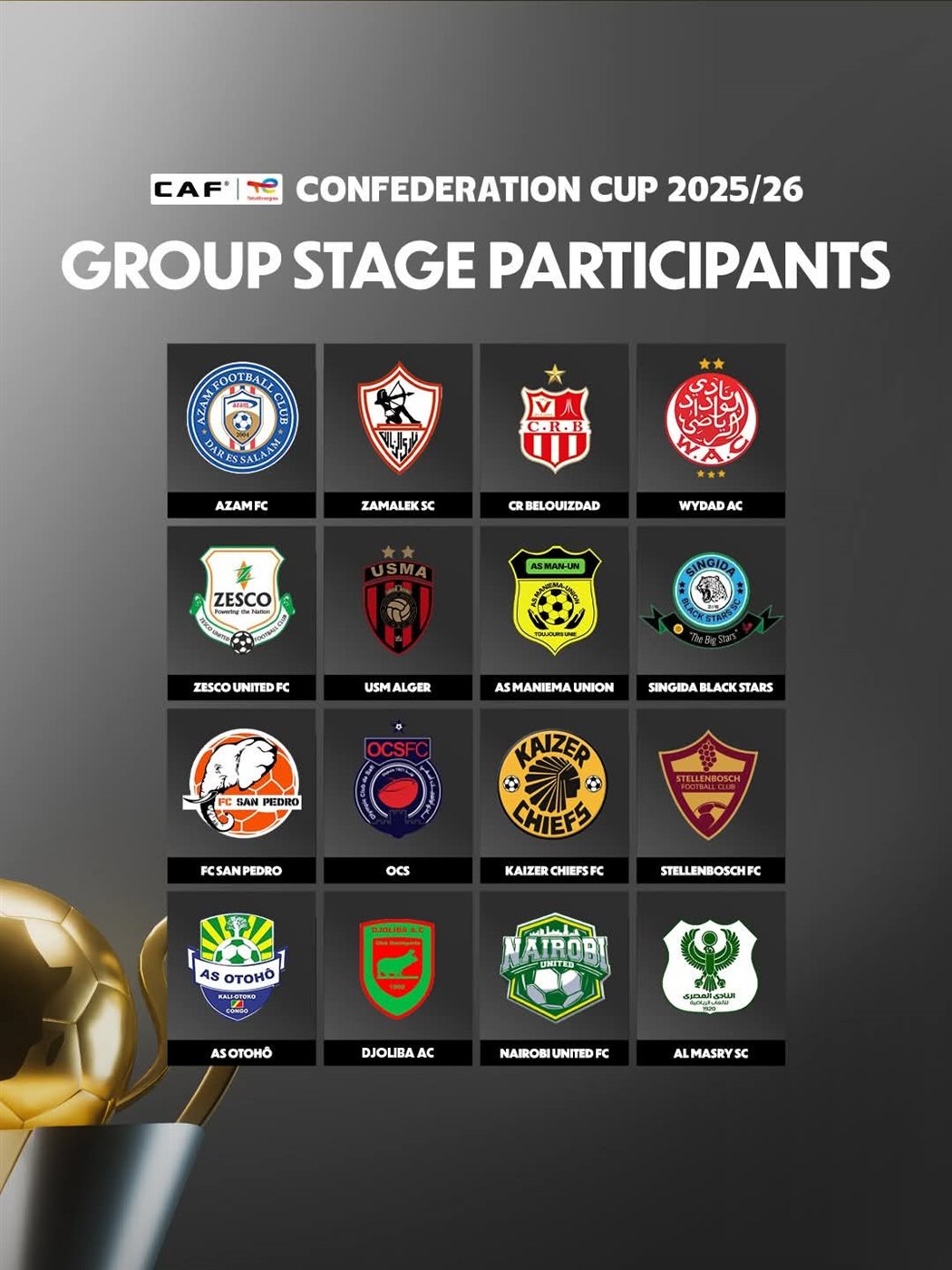 وإلى جوار المصري تضم قرعة الكونفيدرالية التي سيتم الإعلان لاحقًا عن تفاصيلها وتصنيف الفرق المشاركة بها كل من الفرق التالية : عزام اف سي من تنزانيا، الزمالك المصري ، شباب بلوزداد الجزائري ، الوداد المغربي ، زيسكو يونايتد الزامبي، اتحاد العاصمة الجزائري ، مانياما يونيون ممثل الكونغو الديمقراطية، سينجيدا يونايتد التنزاني ، سان بيدرو الايفواري ، أوليمبيك أسفي المغربي ، كايزر شيفز الجنوب أفريقي ، ستيلينبوش الجنوب أفريقي، أوتوهو الكونغولي ، جوليبا المالي ، نيروبي يونايتد الكيني.