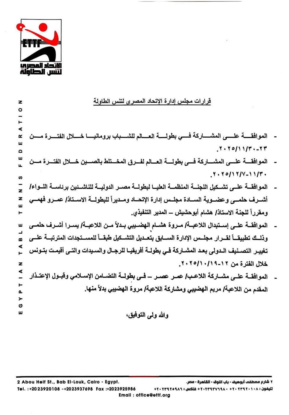 أصدر مجلس إدارة الاتحاد المصري لتنس الطاولة برئاسة اللواء أشرف حلمي، عدة قرارات مهمة خلال اجتماعه الأخير تضمنت الموافقة على مشاركة المنتخب الوطني في بطولات دولية مقبلة، إلى جانب اعتماد بعض التعديلات الإدارية والفنية الخاصة بالمنتخبات.