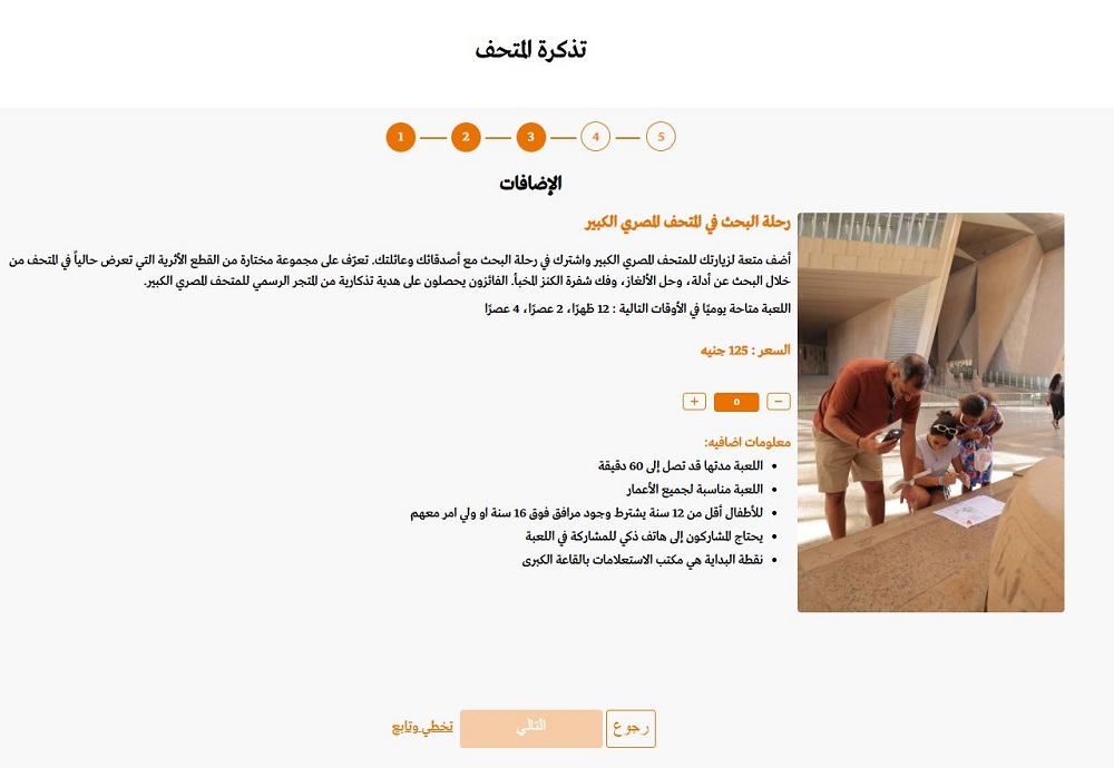 في النافذة الجديدة، يمكنك اختيار “رحلة البحث في المتحف المصري الكبير” وتحديد عدد تذكرتها.