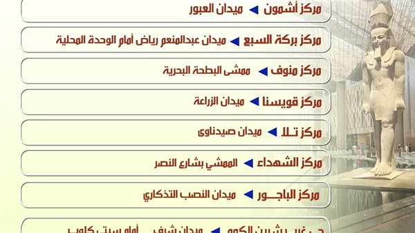 ولمواكبة هذا الحدث العالمي، أعلن اللواء إبراهيم أبو ليمون محافظ المنوفية عن قيام المحافظة بتجهيز شاشات عرض عملاقة بعدد من الميادين والمناطق الحيوية بمختلف مراكز المحافظة، لنقل احتفالية افتتاح المتحف المصري الكبير يوم السبت المقبل 1 نوفمبر، وذلك في إطار حرص المحافظة على إتاحة الفرصة أمام المواطنين لمتابعة هذا الحدث العالمي الذي يُعد أحد أبرز المشروعات الحضارية والثقافية في تاريخ مصر الحديث.