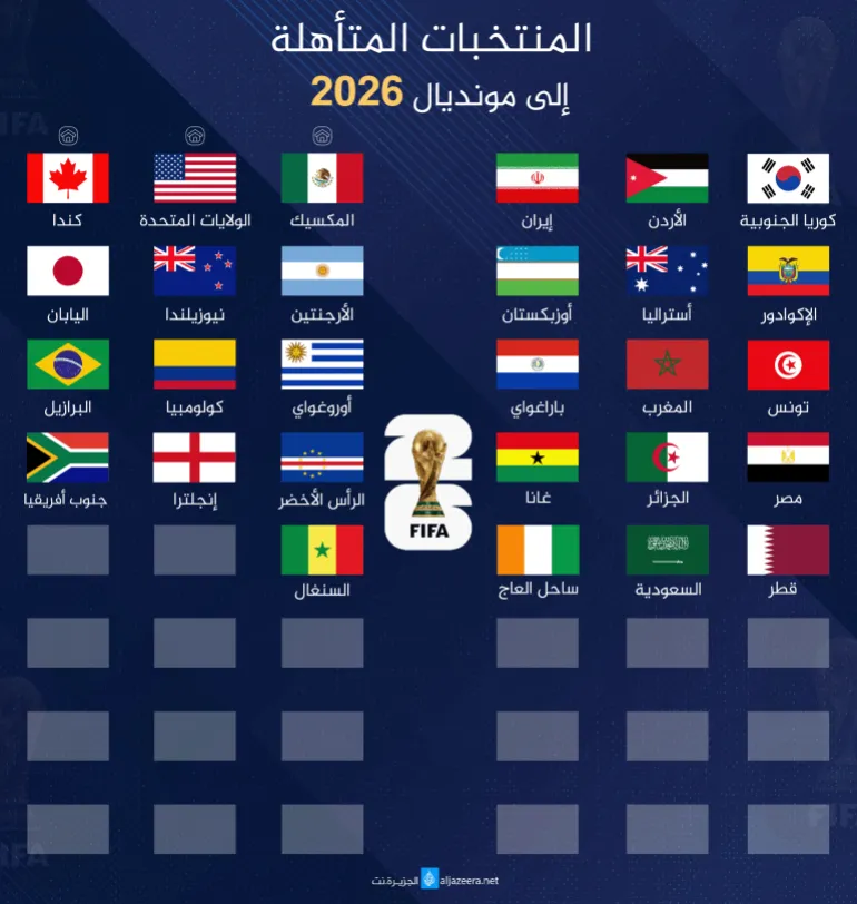 وضمن 28 منتخبا التأهل رسميا لنهائيات كأس العالم 2026، وهم مصر - الجزائر - المغرب - تونس - غانا - كوت ديفوار - السنغال - كاب فيردي - جنوب إفريقيا ومن قارة أمريكا الشمالية كل من أمريكا والمكسيك وكندا، ومن آسيا منتخبات اليابان - إيران – أوزبكستان – كوريا الجنوبية – الأردن – أستراليا - السعودية - قطر ومن قارة أمريكا الجنوبية : الأرجنتين – البرازيل – الإكوادور - كولومبيا - باراجواي - أوروجواي ومن قارة أوروبا إنجلترا ومن قارة أوقيانوسيا نيوزيلاندا.