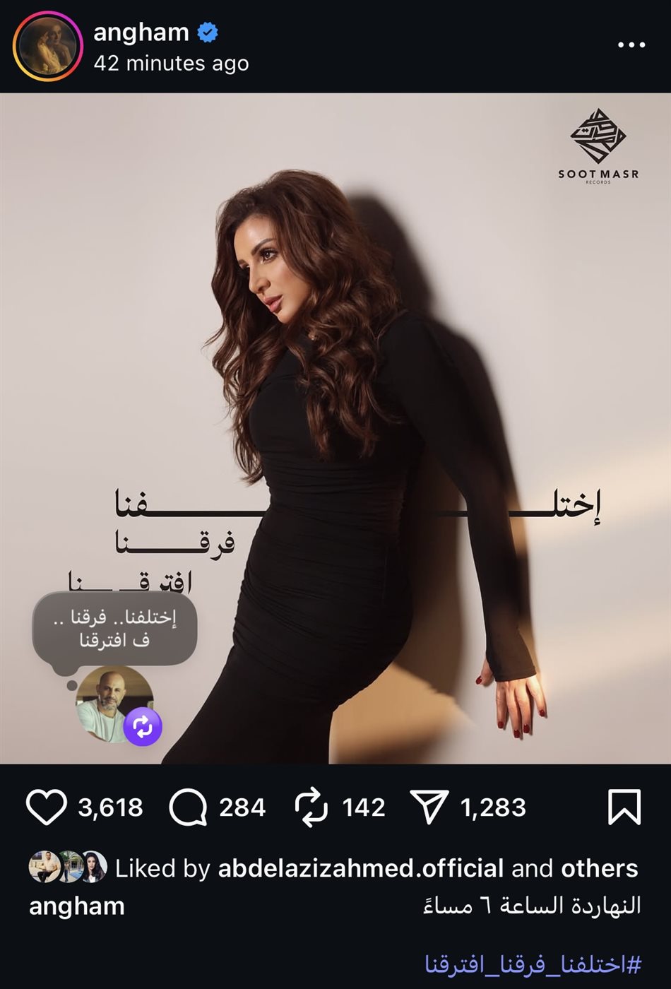 أعلنت الفنانة أنغام عن موعد طرح أحدث اعمالها الغنائية التي تحمل عنوان “اختلفنا فرقنا فافترقنا”، حيث نشرت البوستر الرسمي للأغنية عبر حسابها الشخصي على موقع تبادل الصور والفيديوهات إنستجرام، وعلقت قائلة: “النهاردة الساعة ٦ مساءًا”.
