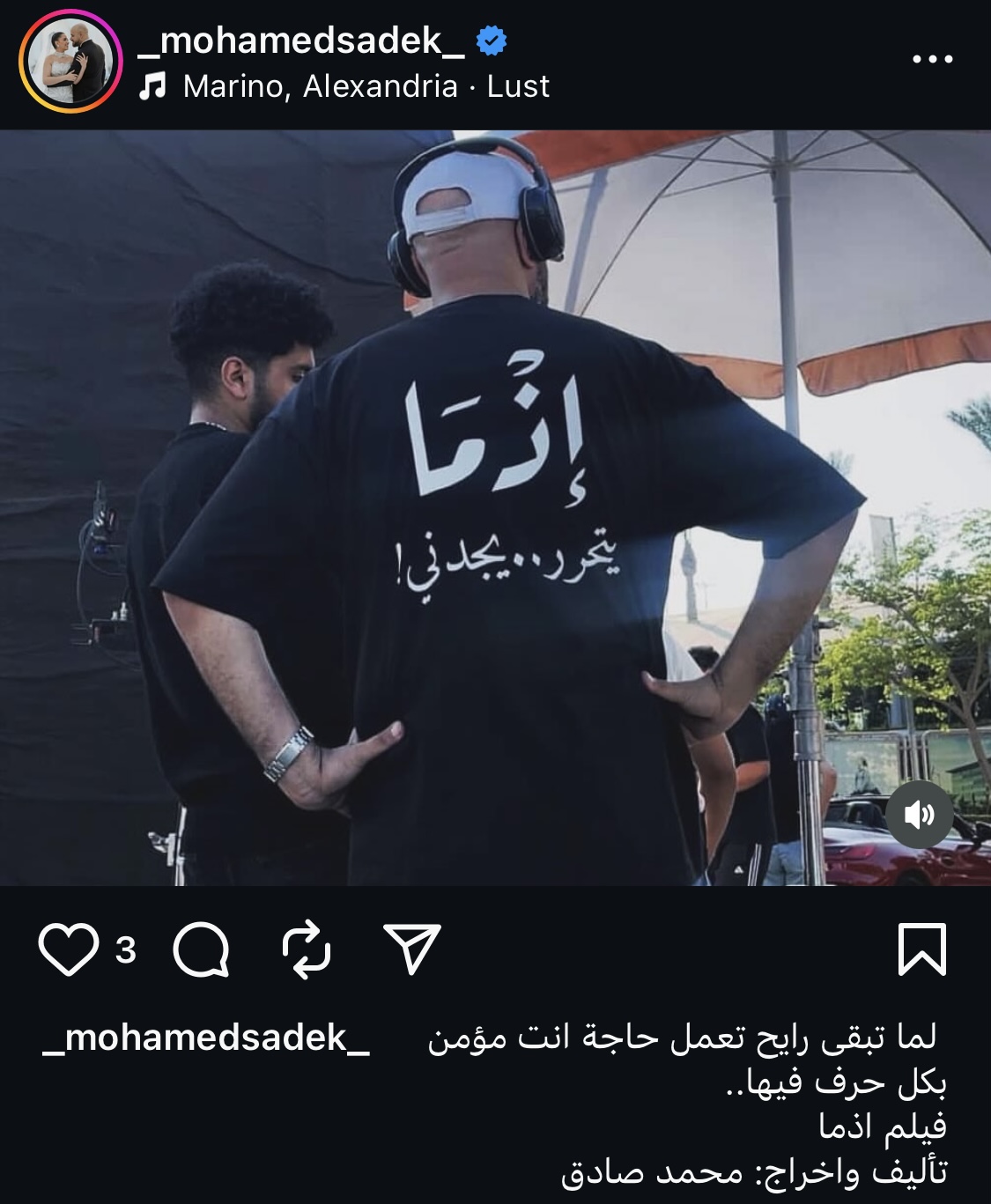 وعلق المخرج محمد صادق على الصورة قائلًا: “لما تبقى رايح تعمل حاجة أنت مؤمن بكل حرف فيها، فيلم إذما، تأليف وإخراج محمد صادق”.