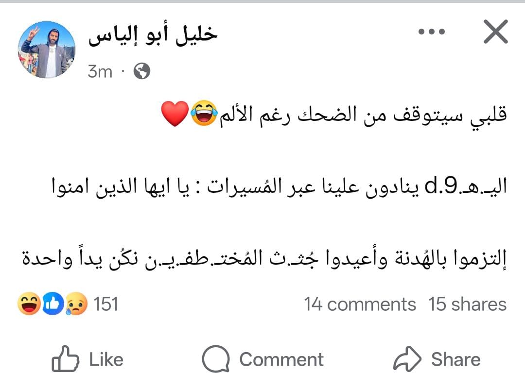 كتب حساب، يدعى خليل أبو إلياس، على صفحته على موقع فيسبوك، اليوم الأربعاء: “قلبي سيتوقف من الضحك رغم الألم، اليهود ينادون علينا عبر المسيرات: يا أيها الذين آمنوا، التزموا بالهدنة وأعيدوا جثث المختطفين نكن يدا واحدة”.