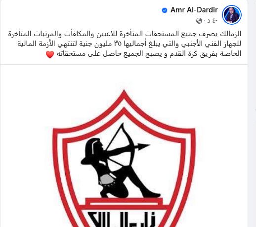 وقال "الدردير" في منشور له عبر حسابه على موقع التواصل الاجتماعي "فيسبوك": الزمالك يصرف جميع المستحقات المتأخرة للاعبين والمكافأت والمرتبات المتأخرة للجهاز الفني الأجنبي والتي يبلغ أجماليها ٣٥ مليون جنية لتنتهي الأزمة المالية الخاصة بفريق كرة القدم و يصبح الجميع حاصل على مستحقاته".
