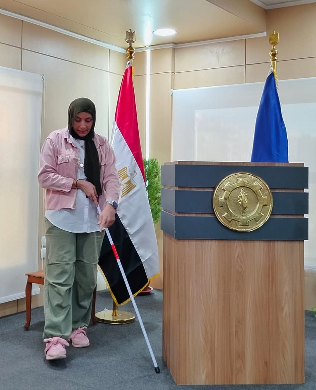 وقدمت إيمان حسن، موجه الإعاقة البصرية، كلمة تعريفية عن العصا البيضاء، تناولت فيها أهميتها باعتبارها رمزًا للأمان والاستقلالية ووسيلة تمكّن الكفيف من المضي بثقة في طريقه.