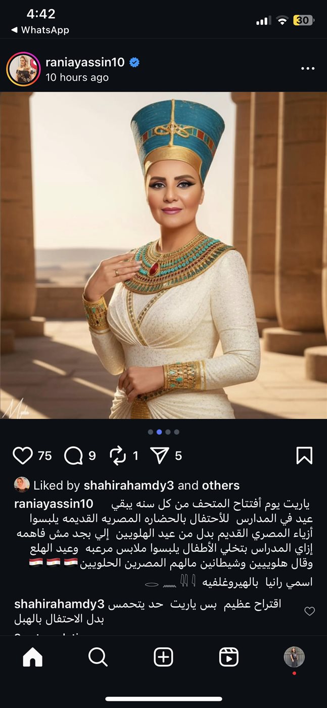 وعلقت الفنانة رانيا محمود ياسين عليهم قائلة: “ياريت يوم أفتتاح المتحف من كل سنة يبقي عيد في المدارس للأحتفال بالحضارة المصرية القديمة يلبسوا أزياء المصري القديم بدل من عيد الهلويين اللي بجد مش فاهمة إزاي المدراس بتخلي الأطفال يلبسوا ملابس مرعبة وعيد الهلع وقال هلوييين وشيطانين مالهم المصرين الحلويين”.