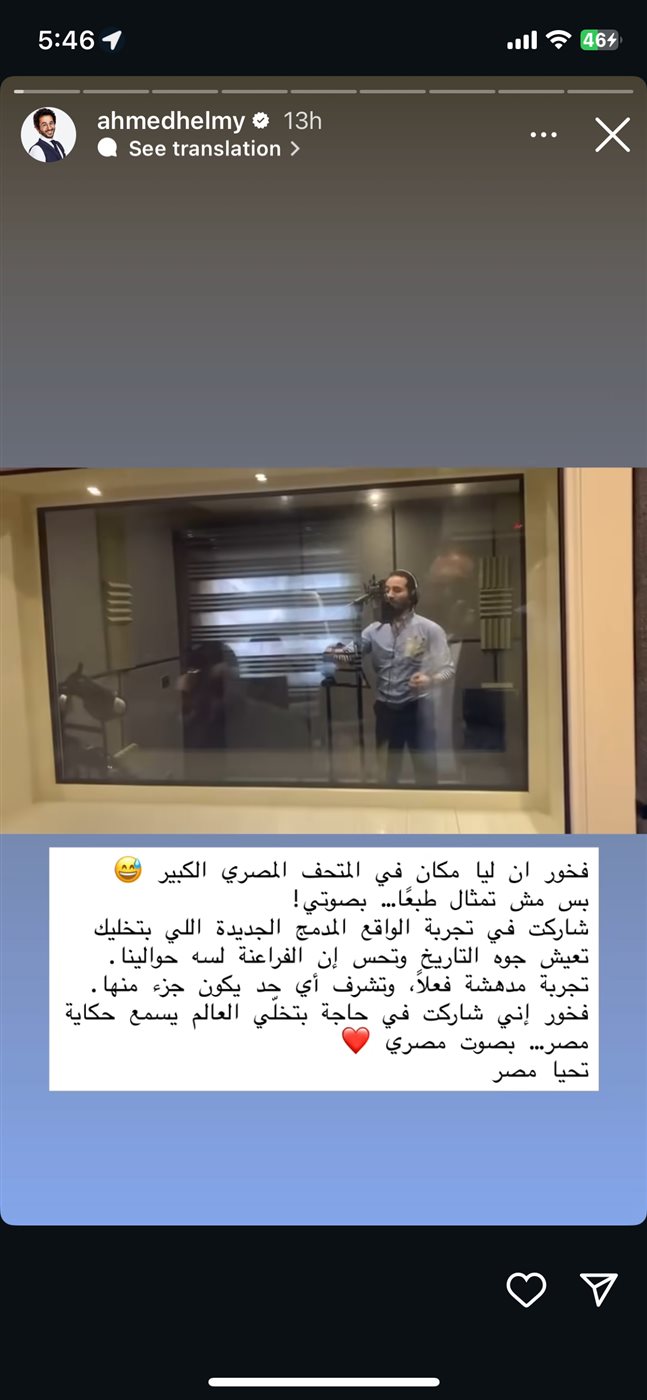 وعلق الفنان أحمد حلمي عليها قائلًا: “فخور ان ليا مكان في المتحف المصري الكبير بس مش تمثال طبعًا... بصوتي!، شاركت في تجربة الواقع المدمج الجديدة اللي بتخليك تعيش جوه التاريخ وتحس إن الفراعنة لسه حوالينا، تجربة مدهشة فعلاً، وتشرف أي حد يكون جزء منها، فخور إني شاركت في حاجة بتخلي العالم يسمع حكاية مصر... بصوت مصري، تحيا مصر”.
