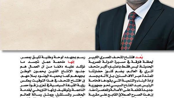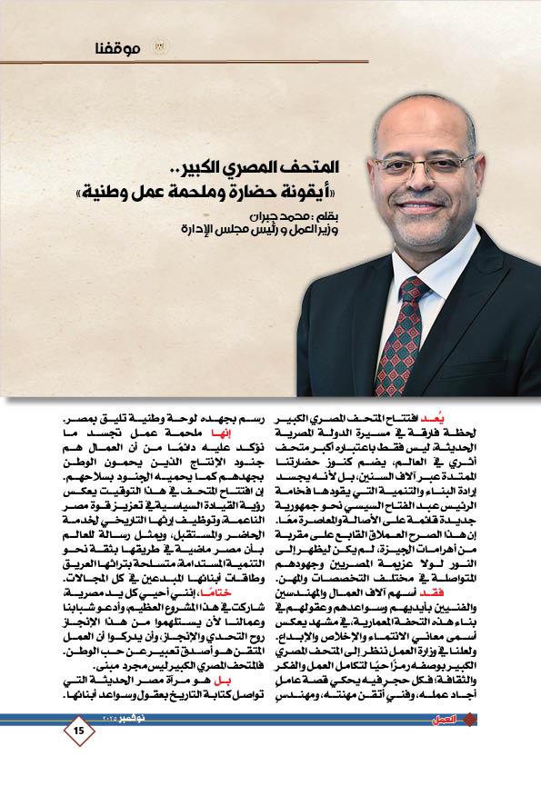 نشر وزير العمل كلمته في جريدة العمل بعنوان.. (المتحف المصري الكبير.. أيقونة حضارة وملحمة عمل وطنية) وهذا نصها :