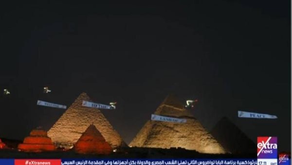 في مشهد حافل حلّقت الطائرات مزينة السماء بعبارات ترحيبية، خلال حفل افتتاح المتحف المصري الكبير أعلى أهرامات الجيزة، إذ حملت لافتة كبيرة كتب عليها: "مرحبًا بكم في أرض السلام".