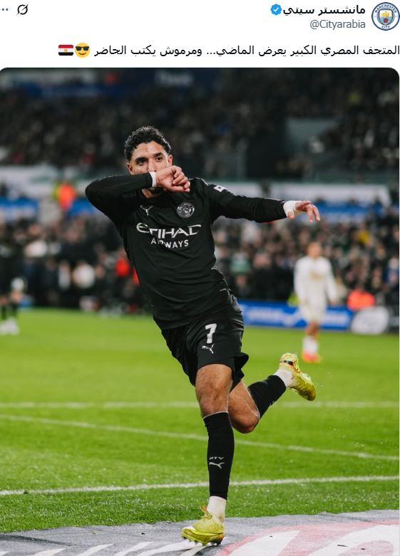 وكتب حساب مانشستر سيتي على منصات السوشيال ميديا مصحوبة بصورة للنجم عمر مرموش:" المتحف المصري الكبير يعرض الماضي… ومرموش يكتب الحاضر".