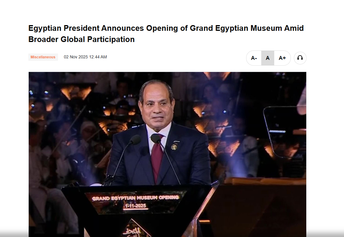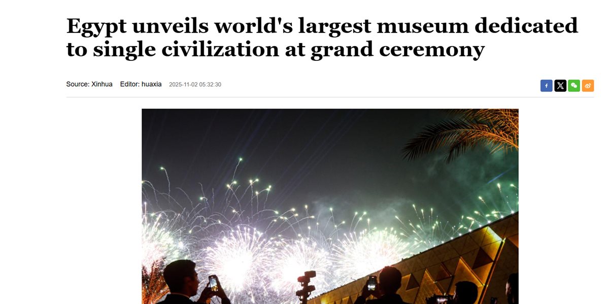 شينخوا الصينية: مصر تفتتح أكبر متحف في العالم مخصص لحضارة واحدة في حفل كبير
