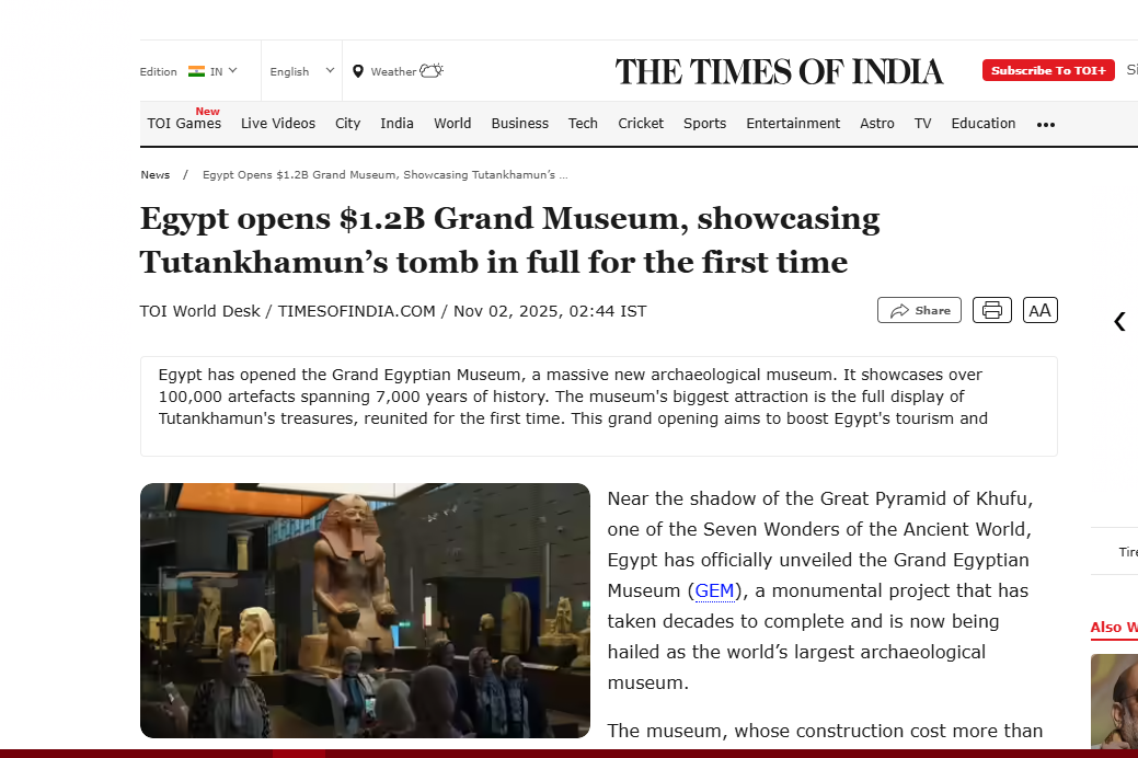 تايم أو ف إنديا : مصر تفتتح متحفًا كبيرًا بتكلفة 1.2 مليار دولار ويعرض مقبرة توت عنخ آمون بالكامل لأول مرة
