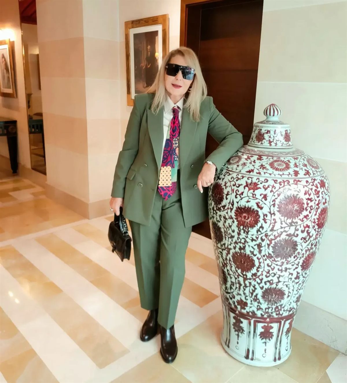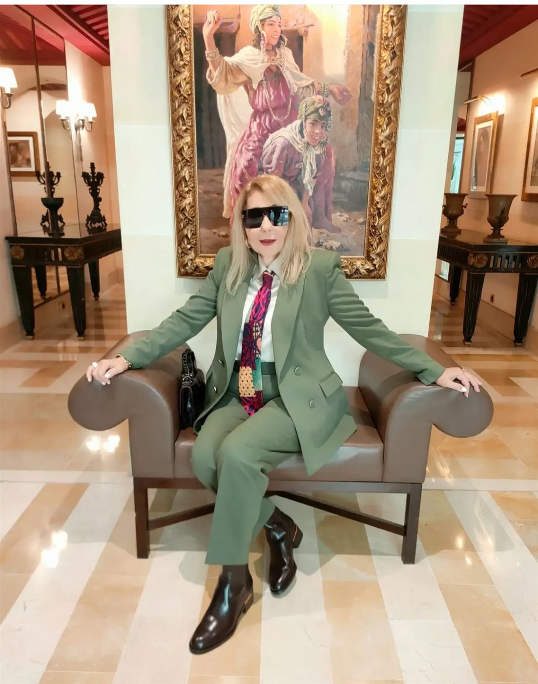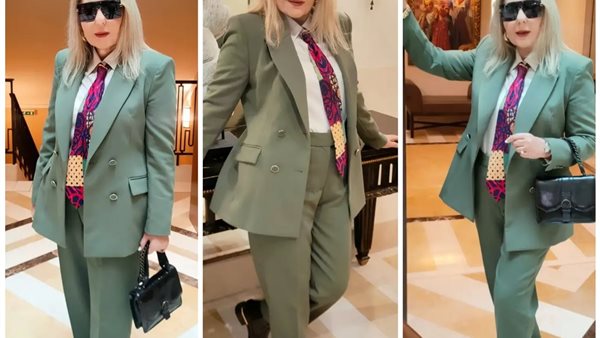ظهرت نادية الجندي ببدلة باللون الأخضر الفاتح مع ربطة عنق تدمج العديد من الألوان، ونسقت معها حذاء باللون الأسود ونظارة شمسية.