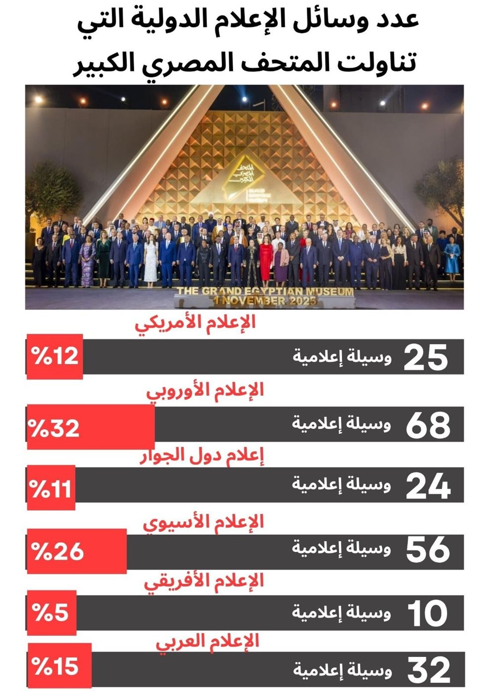 بلغ عدد وسائل الإعلام الدولية الكبري ذات الأهمية والانتشار التي تناولت افتتاح المتحف المصري الكبير حوالي215 وسيلة إعلامية، منها: 25 وسائل إعلام أمريكية، بنسبة 12%، و68 وسيلة إعلامية أوروبية، بنسبة 32%، و24 وسيلة إعلامية من دول الجوار، بنسبة 11%، و56 وسيلة إعلامية أسيوية، بنسبة 26%، 10 وسائل من الإعلام الأفريقي، بنسبة 5%، و32 وسيلة إعلامية من العالم العربي بنسبة 15%، مع ملاحظة عدم تكرار الوسائل التي تناولت أكثر من مادة في تغطياتها.