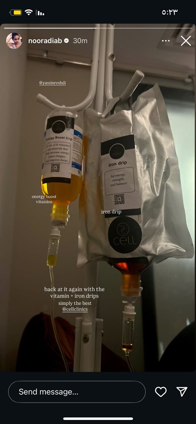 شاركت نور عمرو دياب منذ قليل صورة لها من المستشفى وهي تتناول بعض المحاليل الطبية مثل محلول الفيتامينات ومحلول الحديد .