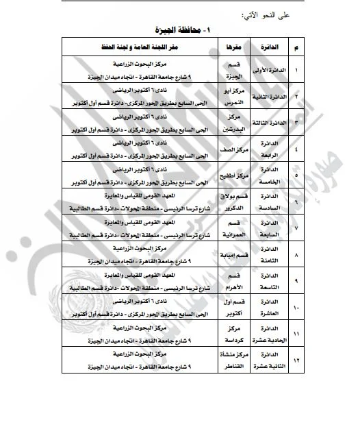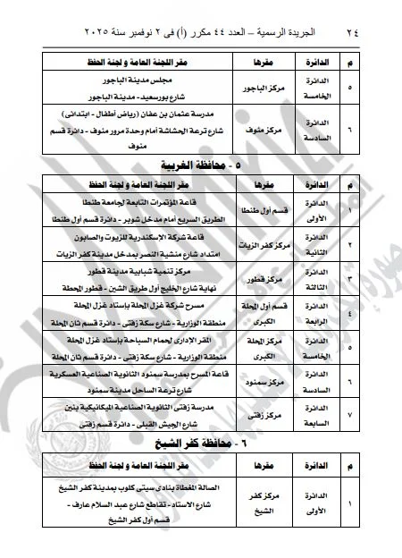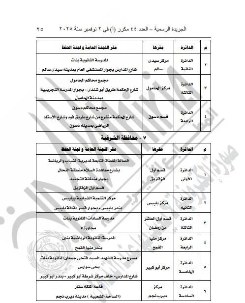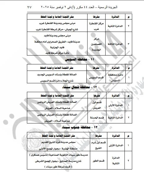 ونشرت الجريدة الرسمية القرار الذي تضمن تفاصيل المقار المخصصة للجان العامة ولجان الحفظ، بالإضافة إلى أرقام هذه اللجان، وذلك لكلا المرحلتين الأولى والثانية من الانتخابات.