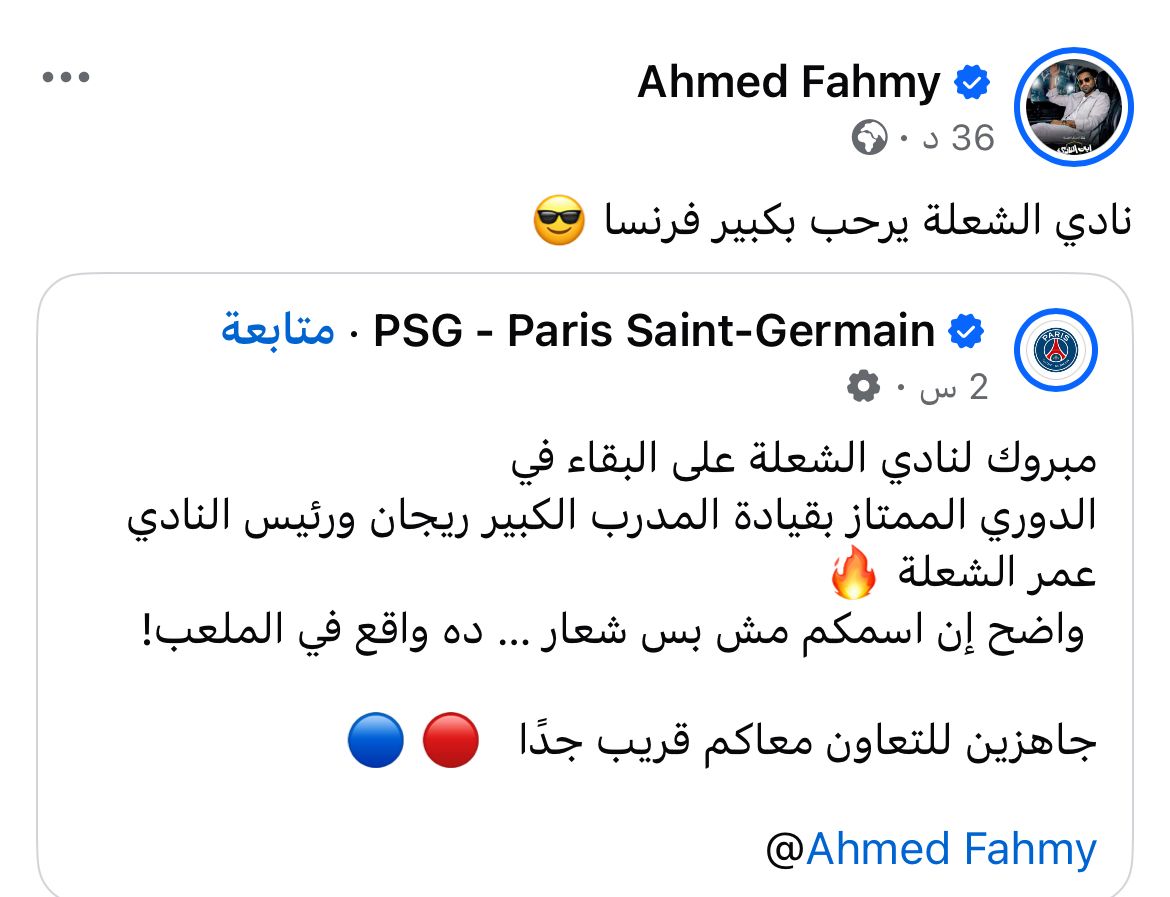 ليرد عليهم أحمد فهمي معلقا: “نادي الشعلة يرحب بكبير فرنسا”.