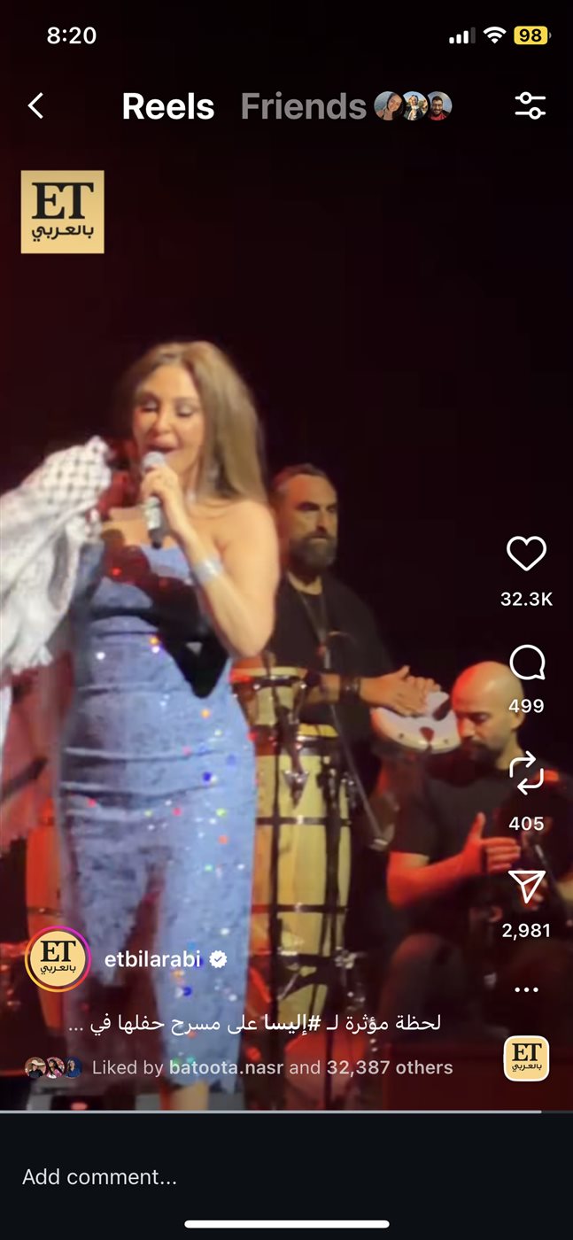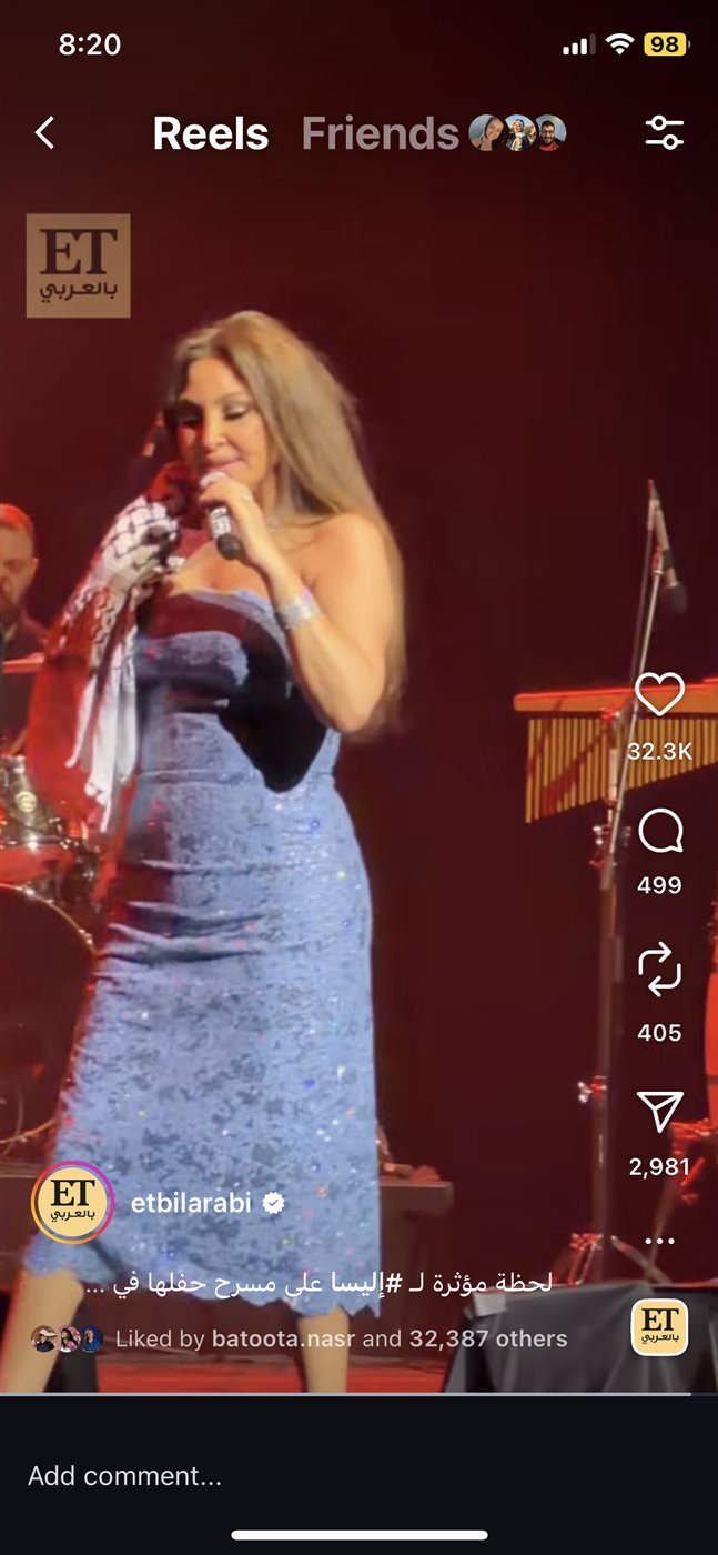 تألقت الفنانة إليسا في حفلها الأخير ب دبي، حيث انتشر مقطع فيديو لها من الحفل وهي تتفاعل مع الجمهور وتغني أغنية فاكر، إلي جانب لافتة إنسانية عندما حملت شال فلسطيني لتعبر عن مساندتها لأهالي غزة وفلسطين.