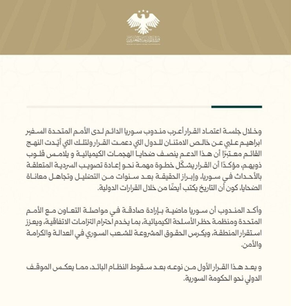 وأعرب السفير السوري الدائم لدى الأمم المتحدة، إبراهيم علبي، خلال جلسة اعتماد القرار، عن امتنان بلاده للدول التي دعمت القرار ولتلك التي أيدت النهج السوري، مؤكدًا أن هذا الدعم ينصف ضحايا الهجمات الكيميائية وذويهم.