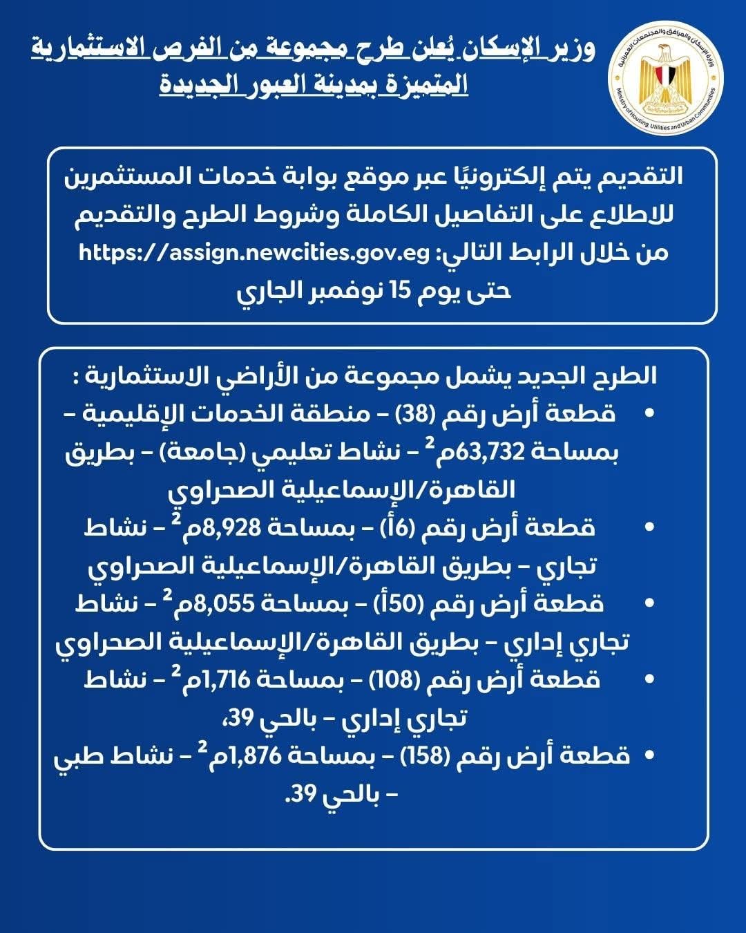 وأوضح المهندس محمود مراد، رئيس جهاز تنمية مدينة العبور الجديدة، أن الطرح الجديد يشمل مجموعة من الأراضي الاستثمارية المميزة على النحو التالي: قطعة أرض رقم (38) – منطقة الخدمات الإقليمية – بمساحة 63,732م² – نشاط تعليمي (جامعة) – بطريق القاهرة/الإسماعيلية الصحراوي، وقطعة أرض رقم (6أ) – بمساحة 8,928م² – نشاط تجاري – بطريق القاهرة/الإسماعيلية الصحراوي، وقطعة أرض رقم (50أ) – بمساحة 8,055م² – نشاط تجاري إداري – بطريق القاهرة/الإسماعيلية الصحراوي، وقطعة أرض رقم (108) – بمساحة 1,716م² – نشاط تجاري إداري – بالحي 39، وقطعة أرض رقم (158) – بمساحة 1,876م² – نشاط طبي – بالحي 39.