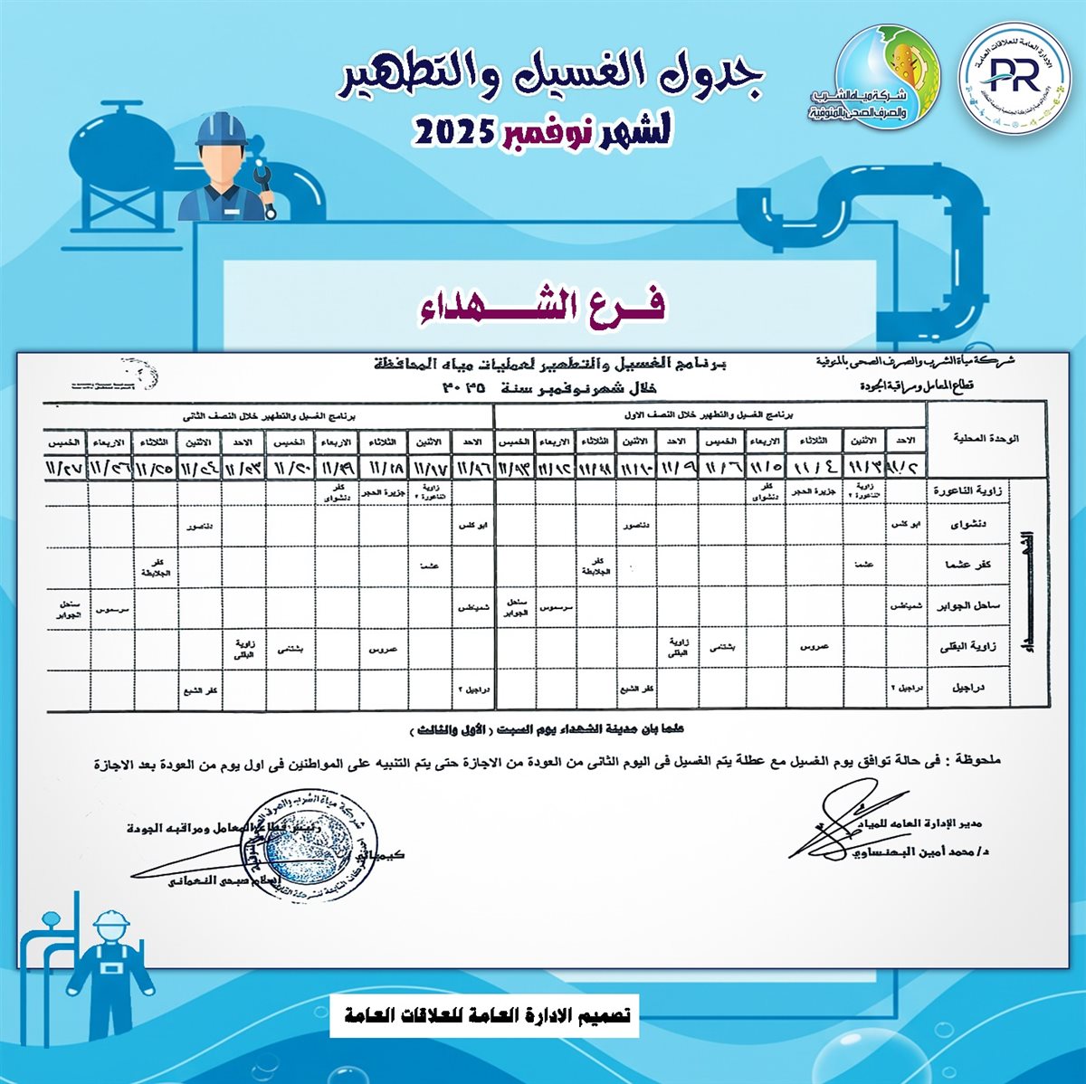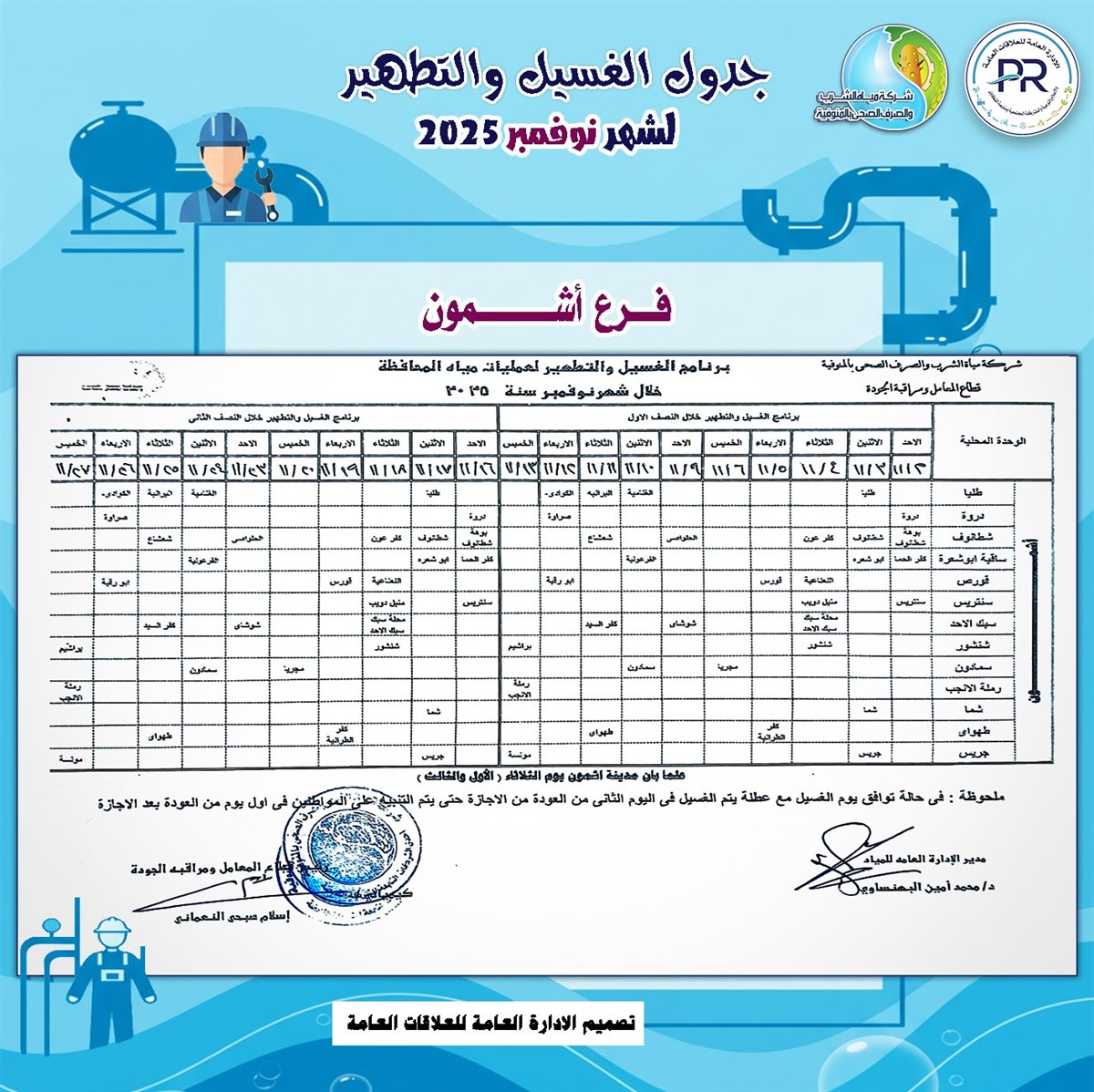 أعلن المهندس رشدي السيد عمر ، رئيس شركة مياه الشرب والصرف الصحى بالمنوفية، خطة غسيل شبكات المياه بكافة مناطق المحافظة خلال شهر نوفمبر 2025م وفقًا للمناطق المحددة بجدول الغسيل الدورى للشبكات .
