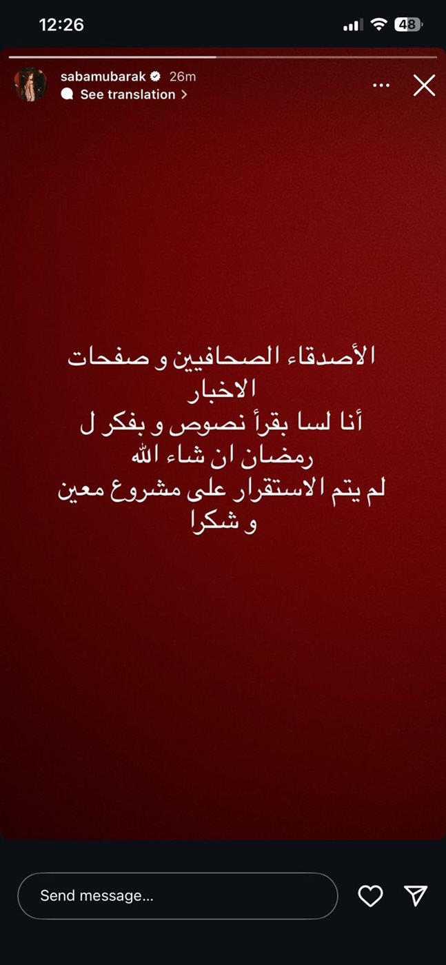 حيث قالت صبا مبارك في منسورها: “الأصدقاء الصحفيين وصفحات الأخبار، أنا لسه بقرأ نصوص وبفكر لرمضان إن شاء الله، لم يتم الاستقرار على مشروع معين، وشكرًا”.
