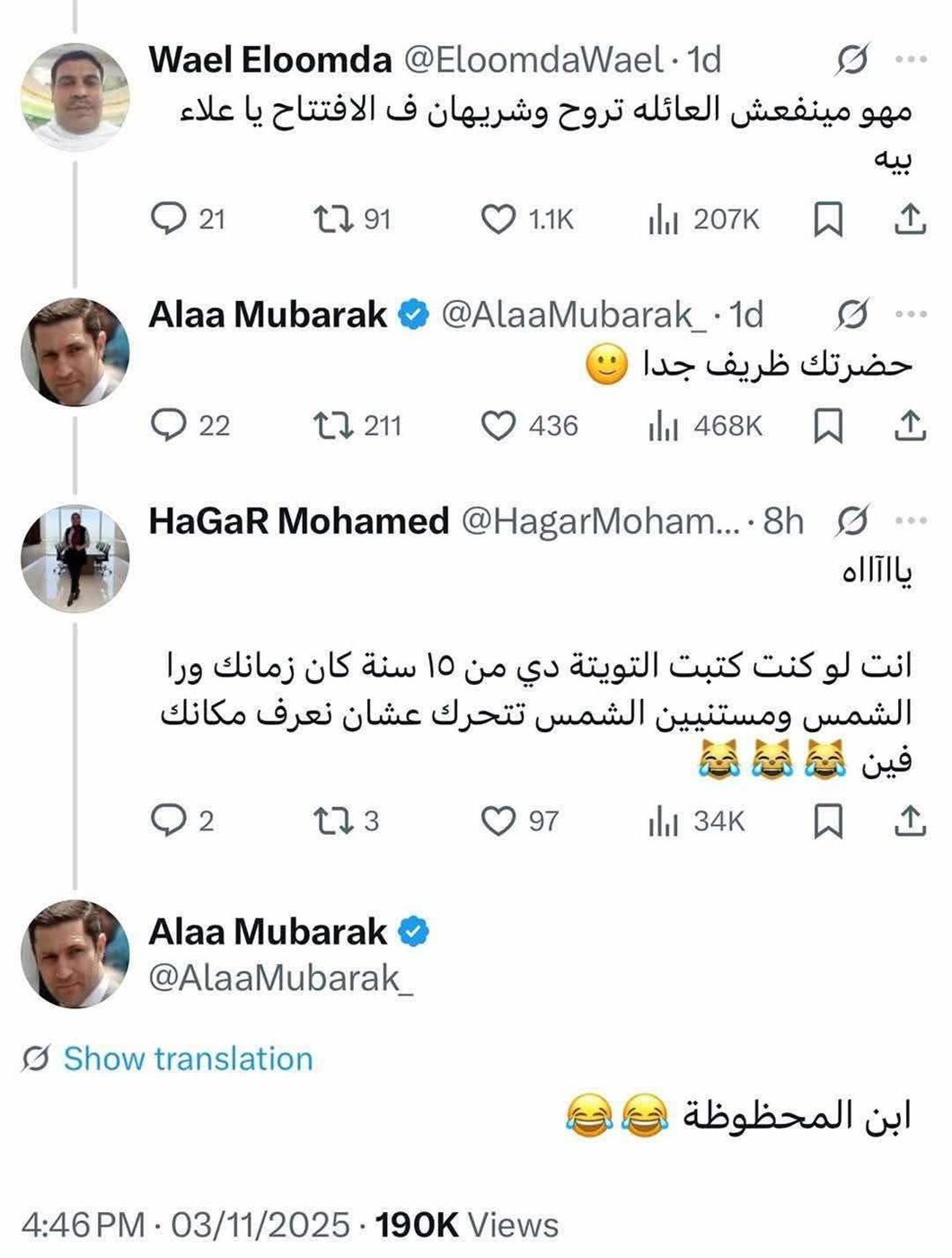 ووجه أحد المتابعين رسالة لعلاء مبارك نجل الرئيس السابق محمد حسني مبارك قائلًا : مهو مينفعش العائلة تروح وشريهان في الافتتاح ياعلاء بيه