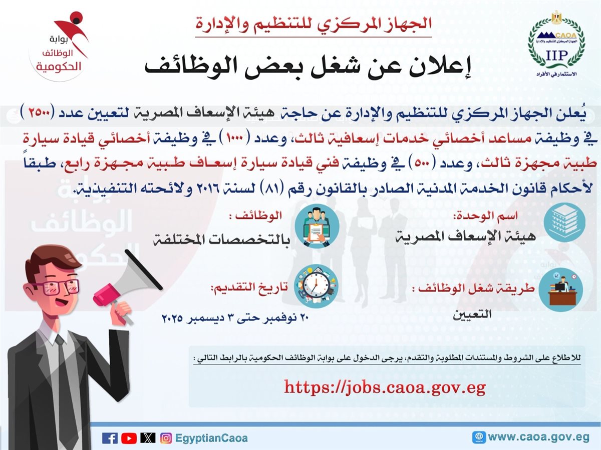التنظيم والإدارة يُعلن عن مسابقة لشغل عدد (4000) وظيفة بهيئة الإسعاف المصرية