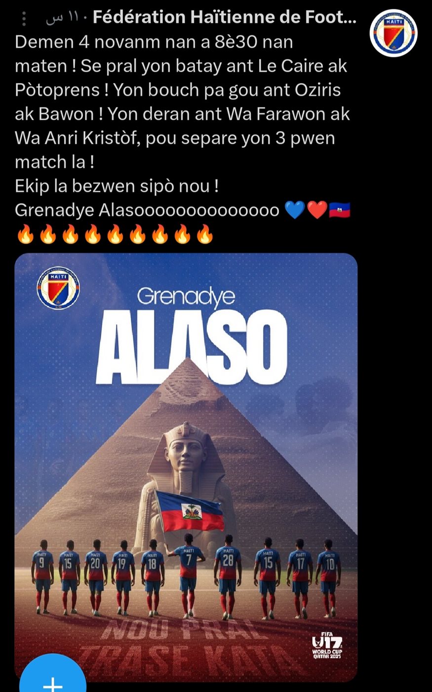و أعلن الحساب الرسمي لصفحة الاتحاد الهايتي عن مواجهة اليوم بين منتخب بلادهم و نظيره مصر بنشر صورة لمنتخب هايتي أمام الأهرامات، موضحا خلالها "مواجهة بين الفراعنة وهنري كريستوف ".