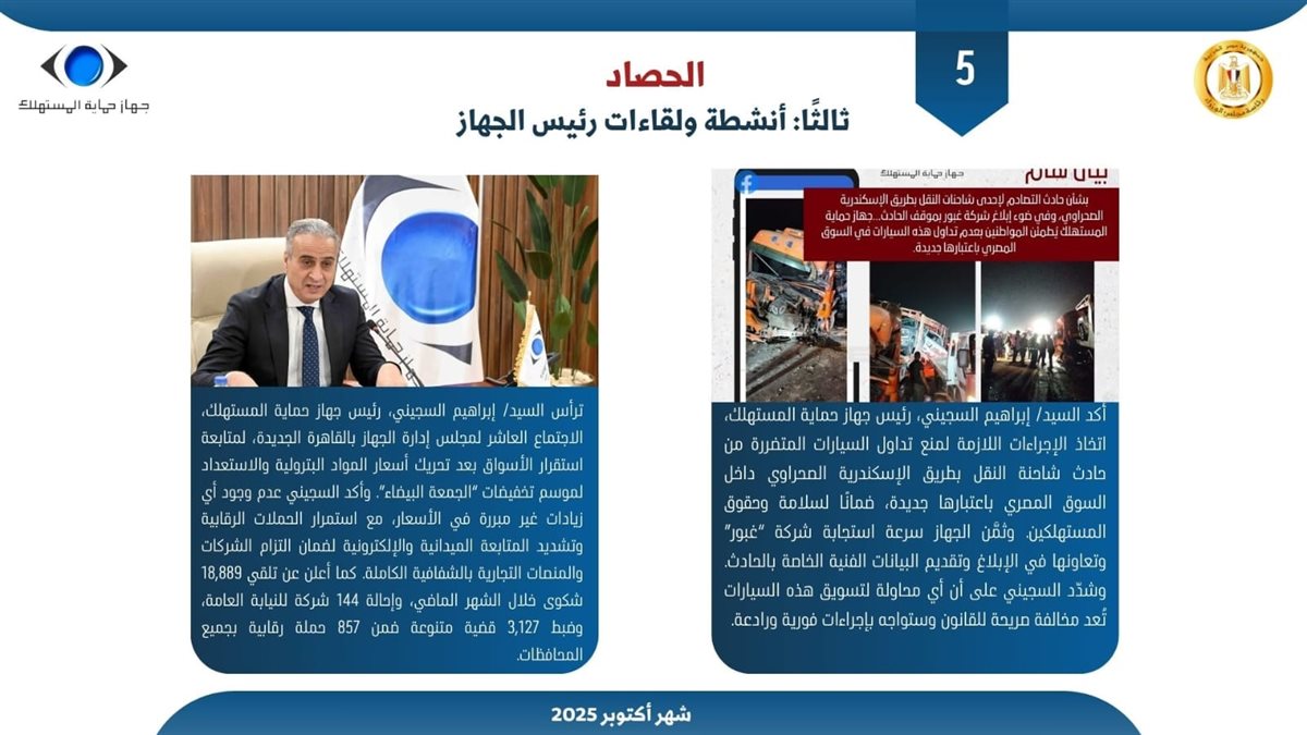 استعرض جهاز حماية المستهلك في تقرير تلقاه السيد ابراهيم السجيني "رئيس جهاز حماية المستهلك"، عن جهوده الرقابية في ضبط الأسواق وأسعار السلع، فضلاً عن تلقي شكاوي المستهلكين في مختلف القطاعات والتعامل معها وأبرز الأنشطة، خلال شهر أكتوبر.