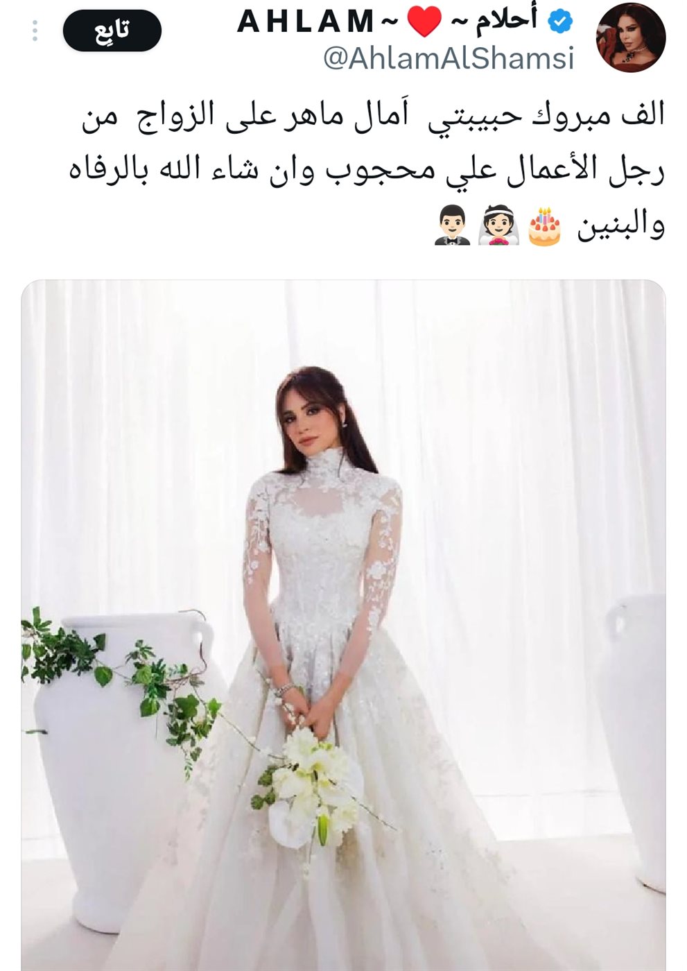 وكتب أحلام تغريدة عبر حسابها على منصة إكس: ألف مبروك حبيبتي اَمال ماهر على الزواج من رجل الأعمال علي محجوب وان شاء الله بالرفاء والبنين.