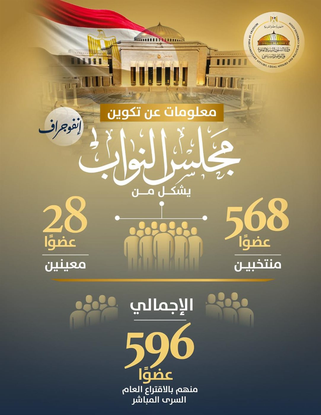 وأوضحت وزارة الشؤون النيابية والقانونية والتواصل السياسي، أن مجلس النواب يتكون من 568 عضوًا منتخبًا، و28 عضوًا بالتعيين، ليكمكون الإجمالي 596 عضوًا منهم بالاقتراع العام السري المباشر.