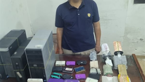 عقب تقنين الإجراءات تم ضبطه، وبحوزته (عدد من الأجهزة والأدوات والمستلزمات المستخدمة فى إستقبال الإشارة ومعالجتها – 3 وحدة معالجة مركزية – 6 محطات لتقوية إشارة البث اللاسلكى).